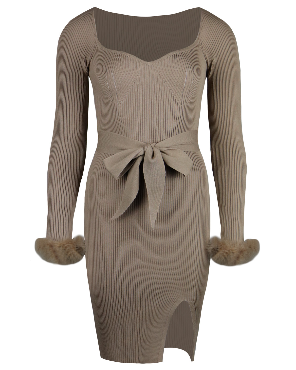 Olive furry detail knitwear dress beige