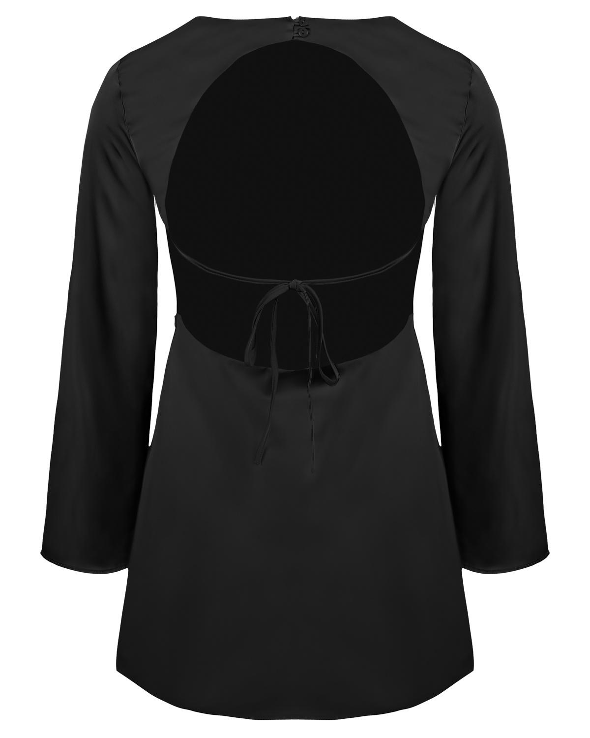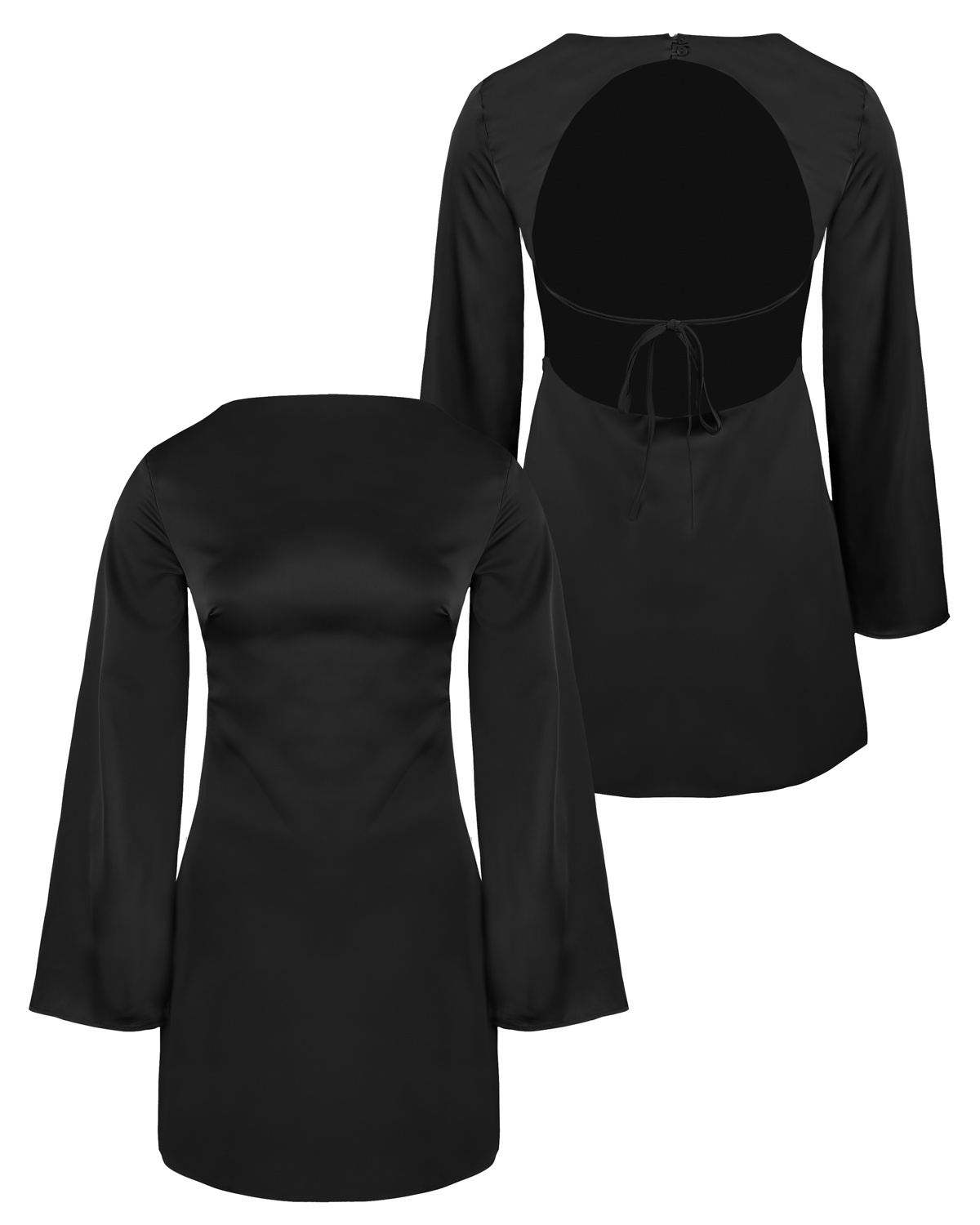 OPEN BACK! Deze prachtige Alondra jurk is gemaakt van een satijnen stof. De jurk heeft een open rug, een strik touwtje, uitlopende mouwen en een hoge hals.... Lees meer