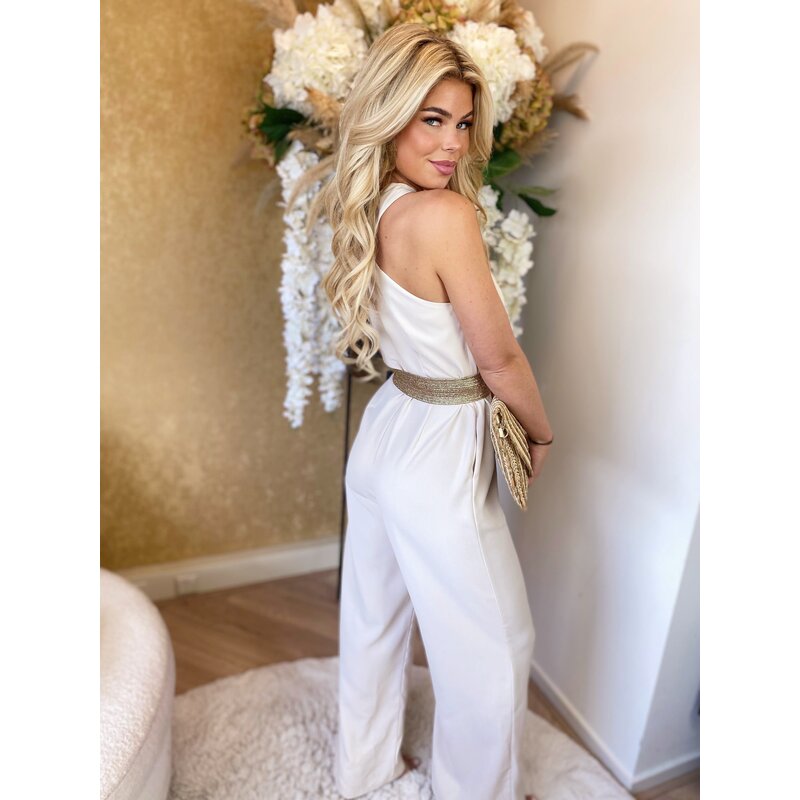Deze stijlvolle halter jumpsuit heeft een elegante pasvorm en een goudkleurig detail bij de hals voor een luxe uitstraling. Perfect voor een chique avond uit of een feestelijke gelegenheid.... Lees meer