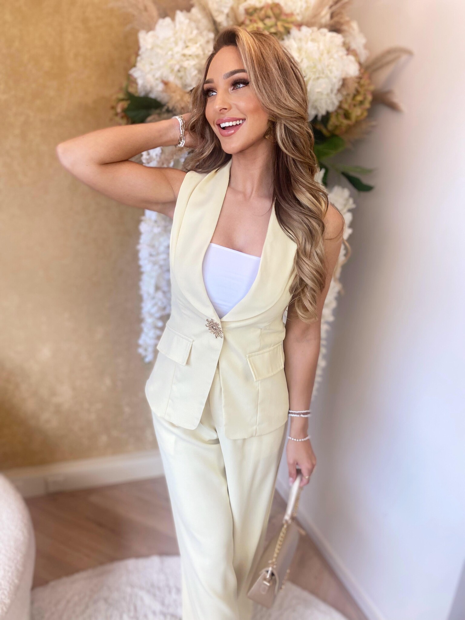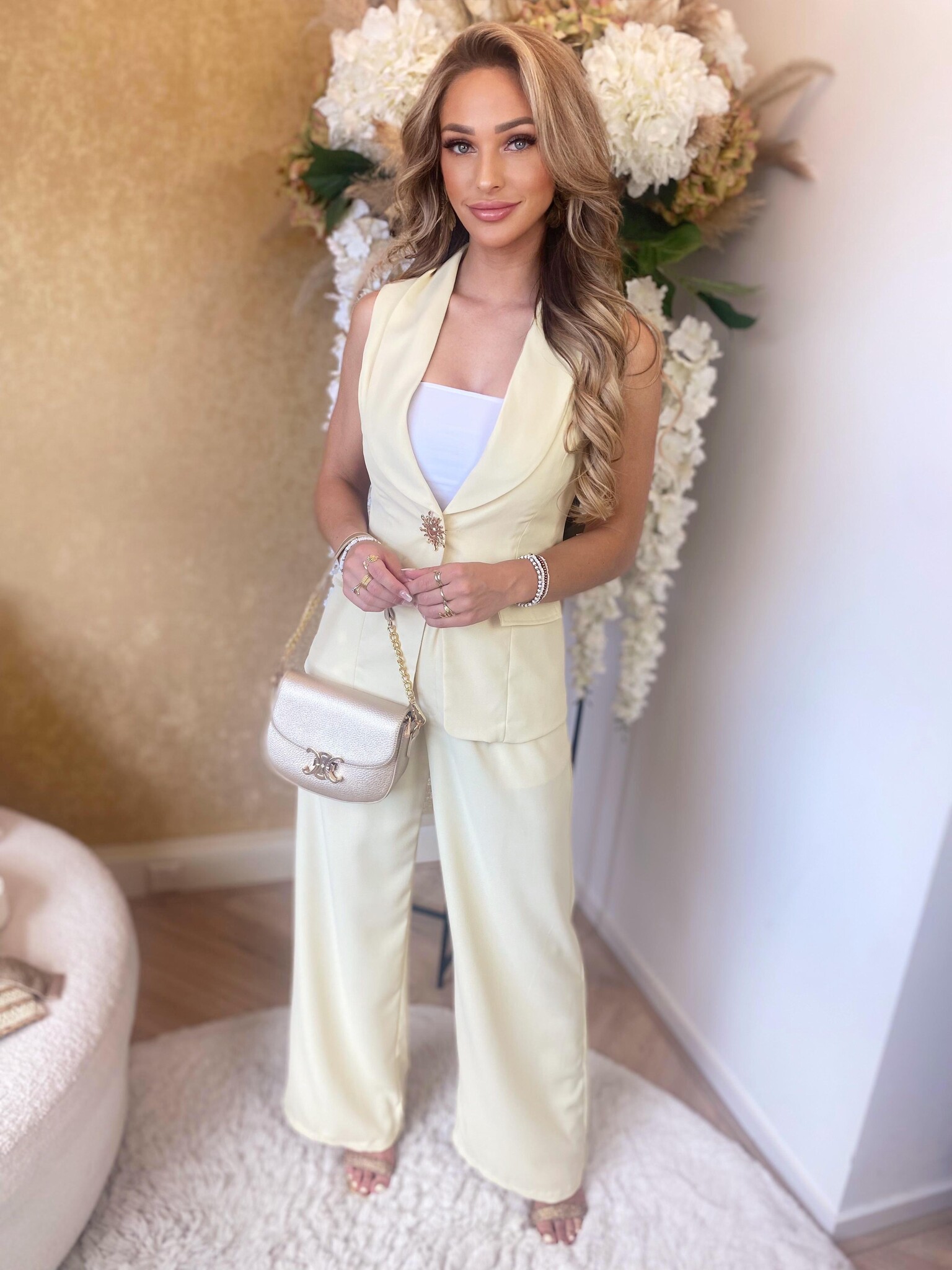 MUSTHAVE ALERT! We hebben de perfecte set voor dit seizoen gevonden. Deze set bestaat uit een gilet met een wide leg pantalon in de musthave kleur butter yellow.. Perfect voor een chique en comfortabele look!.......... Lees meer