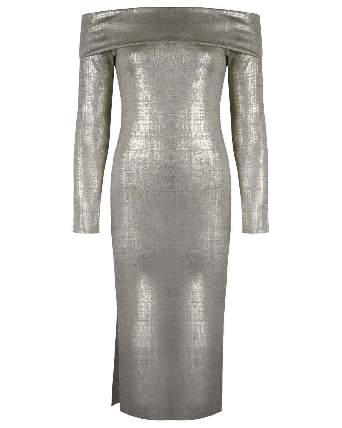 METALLIC MUSTHAVE! Deze prachtige Brielle jurk heeft een off shoulder fit gecombineerd met een midi lengte en split op het rechter been. De stretchy glimmende stof maakt dit een heerlijke jurk voor de feestdagen.... Lees meer