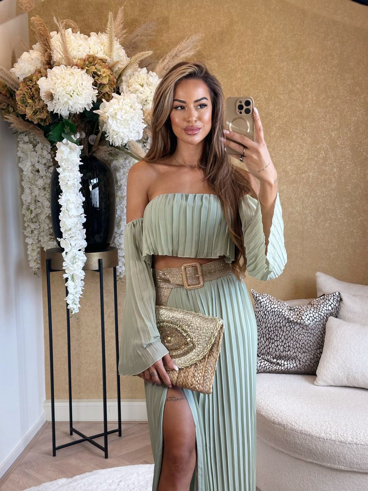 PLISSE DETAIL! Deze geweldige Brinley set bestaat uit een maxi rok en een cropped top. De set is gemaakt met een plisse stof en heeft een split aan de linkerzijde. Prachtig samen maar ook los leuk te combineren... Lees meer