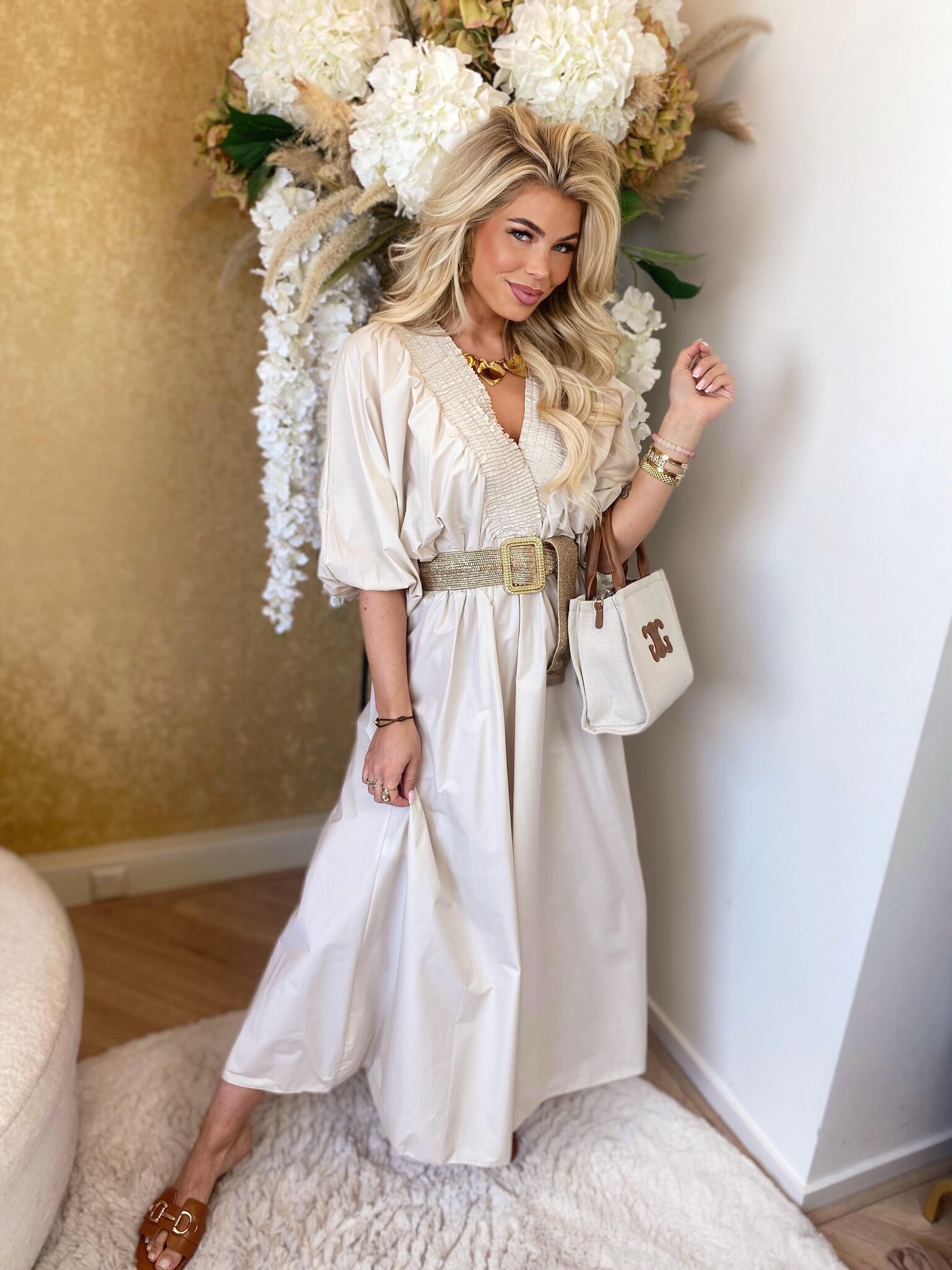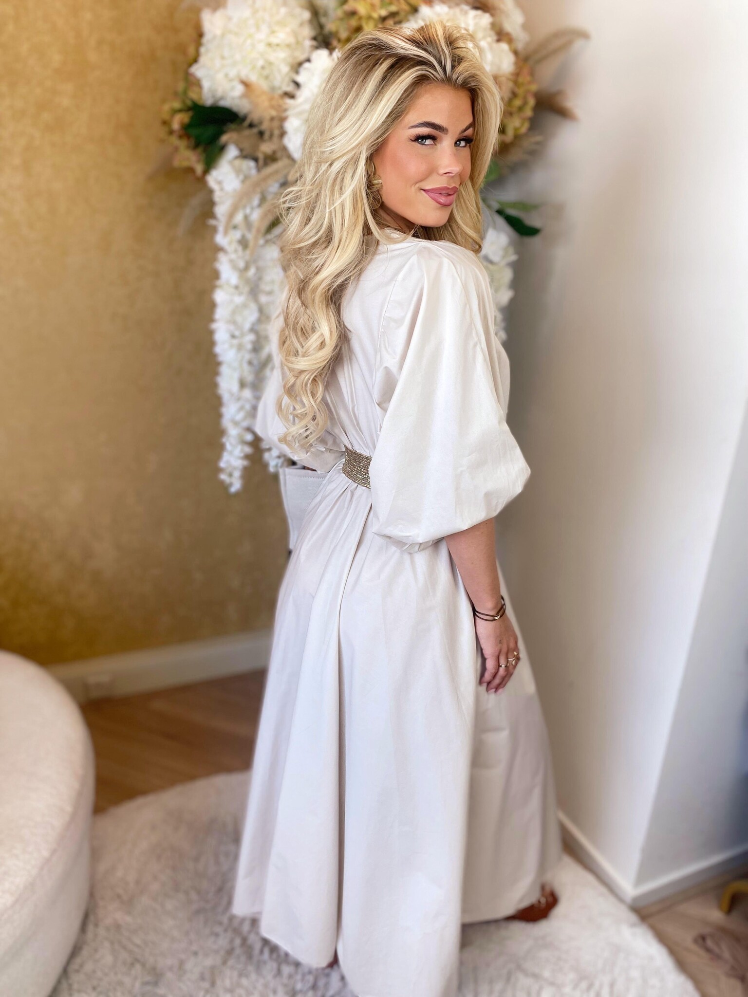 Deze stijlvolle maxi jurk is een must-have voor elke garderobe. De jurk heeft een diepe V-hals, een vrouwelijke taille, en elegante pofmouwen voor een modieuze uitstraling. Perfect voor een zomerse dag uit of een chique diner.... Lees meer