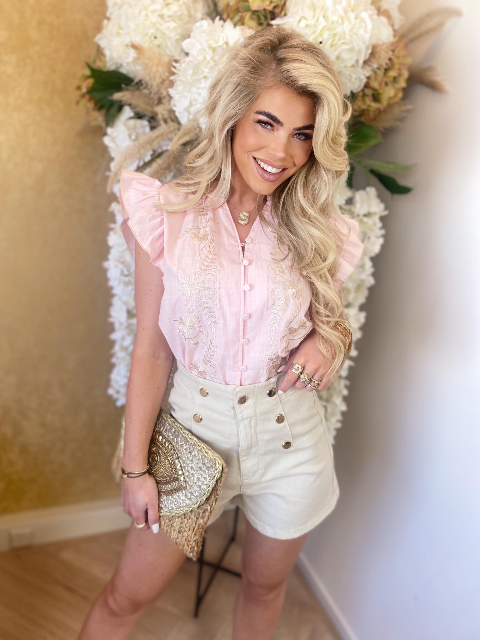 RUFFLE DETAIL! Dit nieuwe blouse is te leuk voor dit seizoen! Hij is gemaakt van katoen stof waardoor hij lekker luchtig is. De blouse heeft ruffle mouwtjes & luxe opdruk vandaar dat wij hem DUBAI blouse noemen.... Lees meer