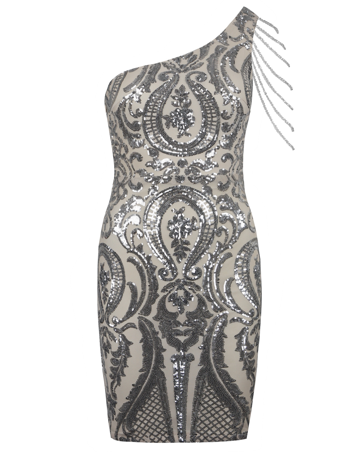 BEADED DETAILS! Deze prachtige jurk met sequins is perfect voor een feestje. De sequins zijn in een prachtig patroon geplaatst. De jurk heeft een one shoulder fit met kraaltjes op de arm.... Lees meer