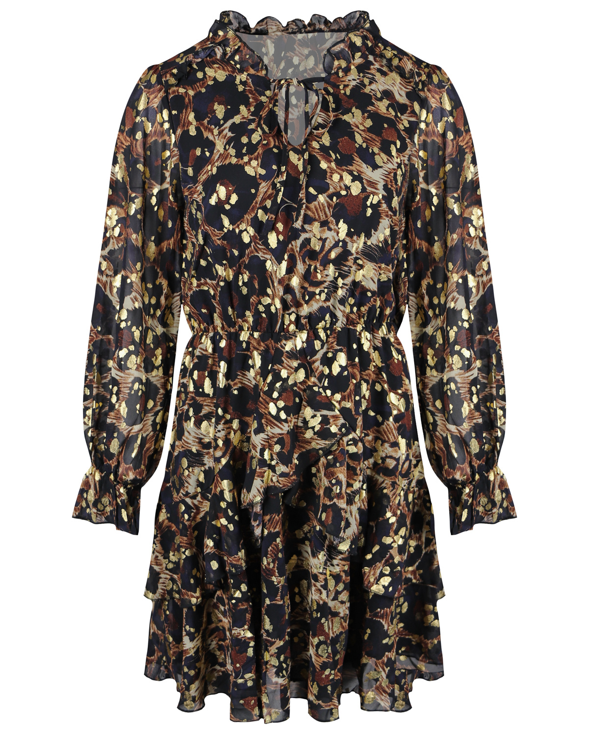 PRINT LOVE! De Erin jurk heeft een prachtige print met golden metallic details. De jurk heeft een touwtje in de hals en ruffle details. Combineer de jurk met high heels of boots om de look af te maken.... Lees meer