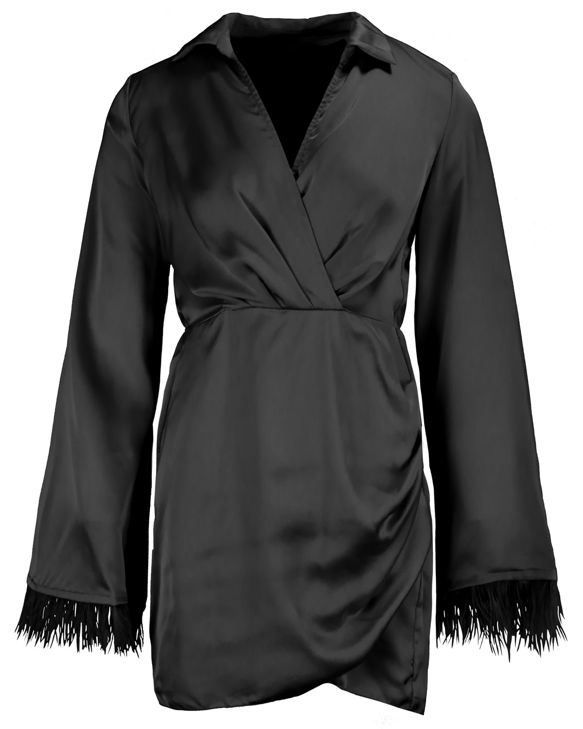 FEATHER DETAIL! Hoe mooi is dit jurkje in satin look stof ?! Aan de mouwen zitten veer details dit zien we steeds meer en is helemaal on trend!... Lees meer