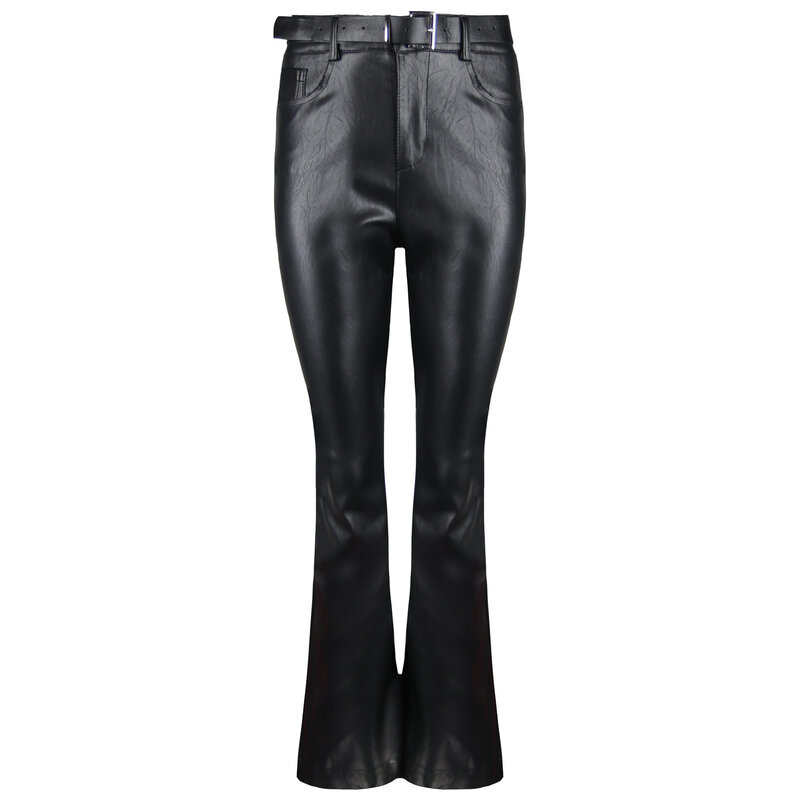 LEATHER MUSTHAVE! Iedereen houdt van een goede leren broek. Daarom is deze in flared model een echte musthave! Prachtig te combineren met verschillende tops. De broek komt met een riem.