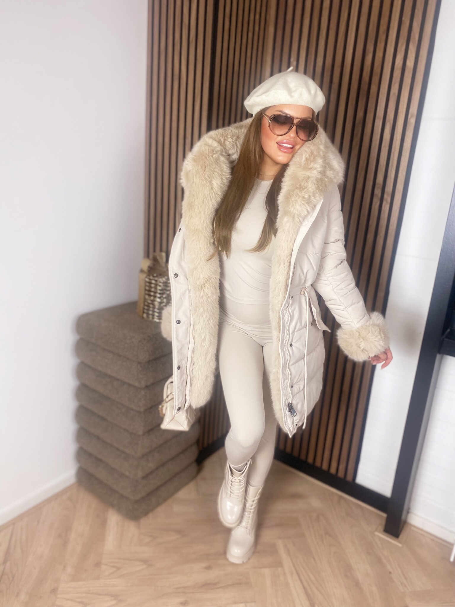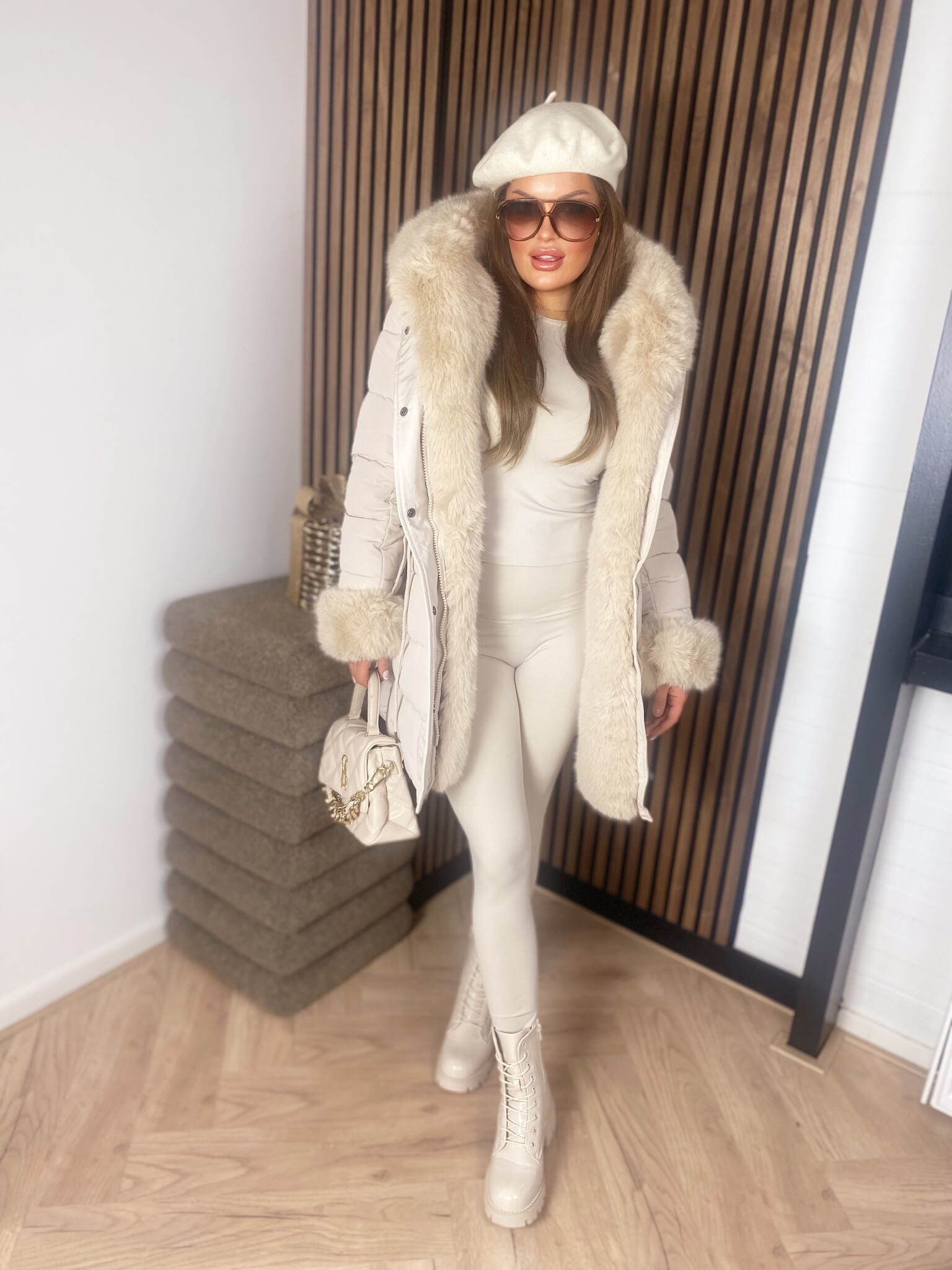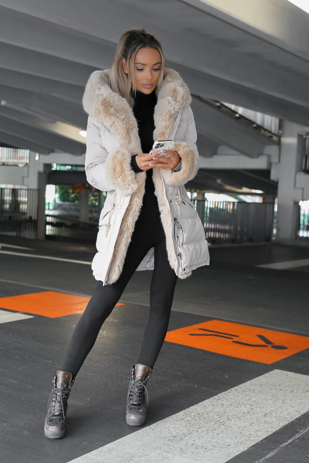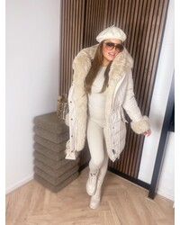FUR DETAIL! Deze jas heeft prachtige imitatie bont details. De jas is heerlijke warm door de voering en dikke stof. De jas heeft aan de binnenkant een afneembare bont voering, capuchon, aantrek touwtjes in de taille en een knoop- en ritssluiting.... Lees meer