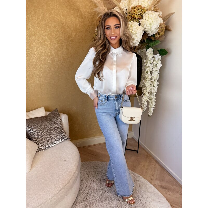 Stijlvolle satijnen blouse met kanten details langs de kraag en manchetten voor een vrouwelijke, chique uitstraling.... Lees meer