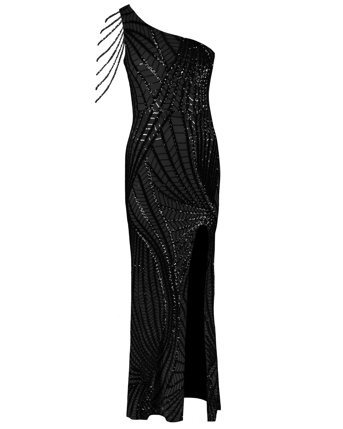 BEADED DETAIL! Deze nieuwe sequin maxi jurk is perfect voor jouw volgende feestje. De jurk heeft one shoulder fit met op de schouder kralen kettinkjes. Op het linkerbeen zit een hoge split.... Lees meer