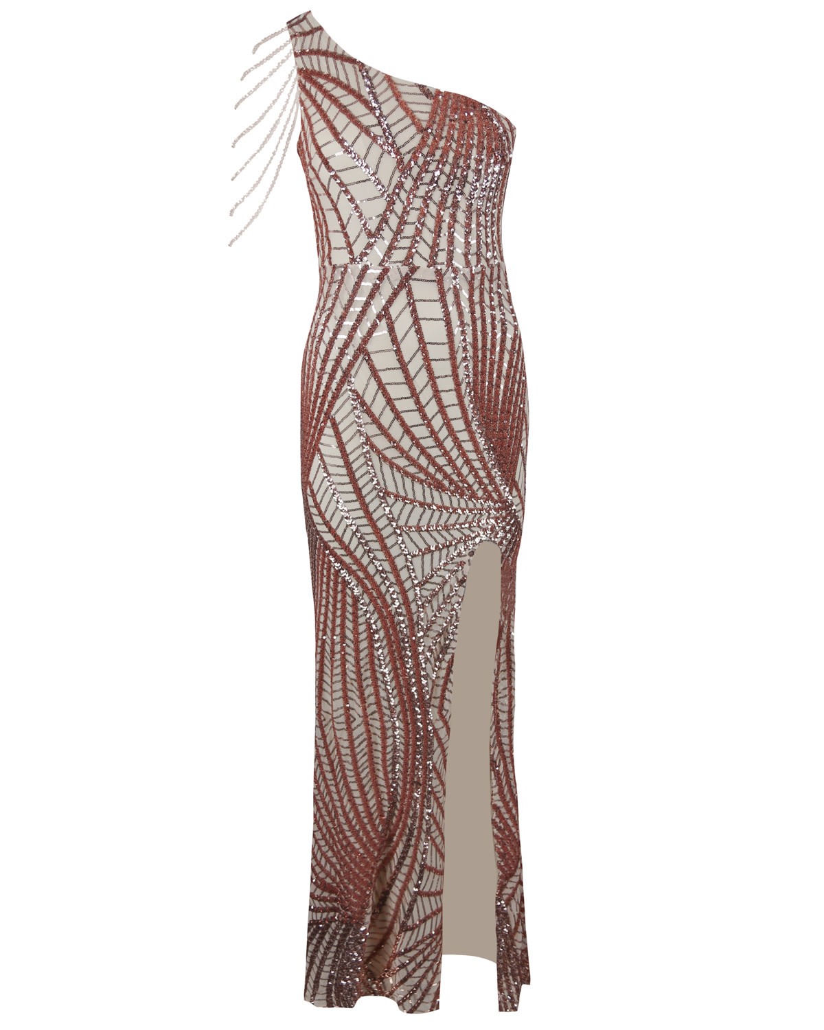 BEADED DETAIL! Deze nieuwe sequin maxi jurk is perfect voor jouw volgende feestje. De jurk heeft one shoulder fit met op de schouder kralen kettinkjes. Op het linkerbeen zit een hoge split.... Lees meer