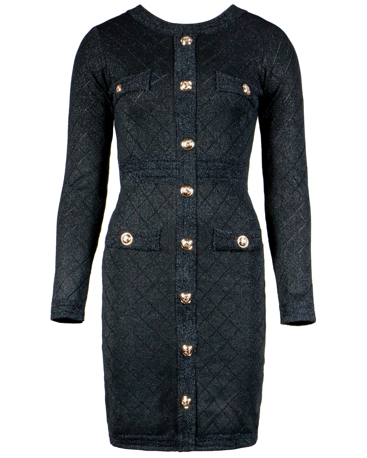 SUBTILE GLITTER! Deze jurk is gemaakt met een lurex draad waardoor hij een lichte glitter look heeft. Ook heeft hij een mooi patroon en gouden buttons.... Lees meer