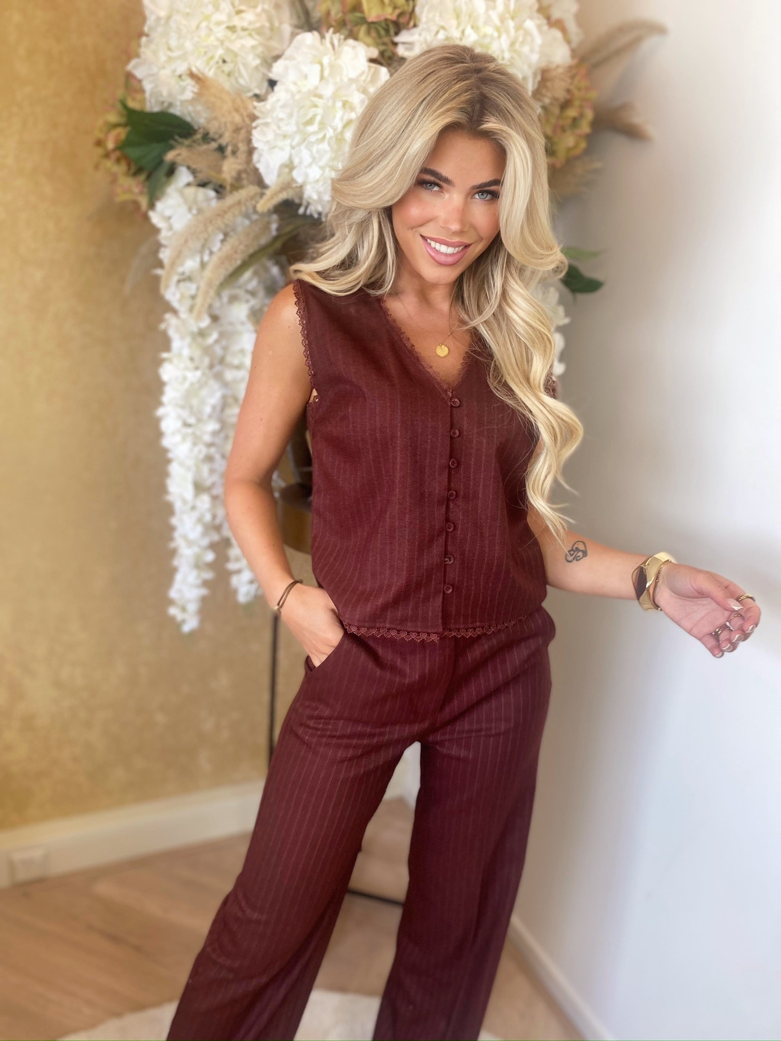 BEST BASIC! De Jody gilet heeft en een oversized pasvorm. Het gilet heeft een pinstripe in de mooie zachte stof en in de hals. mouwen en onderkant een subtiel kanten randje. Perfect te combineren met de Jody pantalon en de Jody gilet.... Lees meer