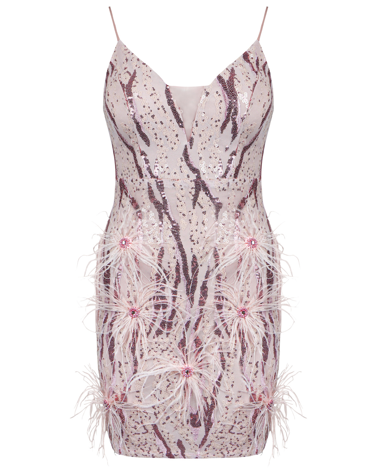 FEATHER DETAIL! We zijn helemaal fan van de Juliette jurk! De jurk is perfect voor een feestje. De sequin zijn in een patroon geplaatst, op de onderkant zitten veren details en bij de borst zit een klein mesh detail.... Lees meer