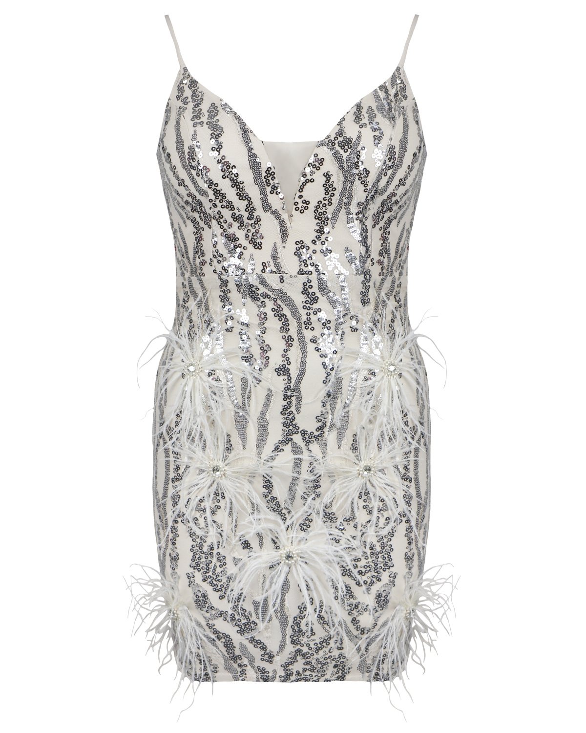FEATHER DETAIL! We zijn helemaal fan van de Juliette jurk! De jurk is perfect voor een feestje. De sequin zijn in een patroon geplaatst, op de onderkant zitten veren details en bij de borst zit een klein mesh detail.... Lees meer