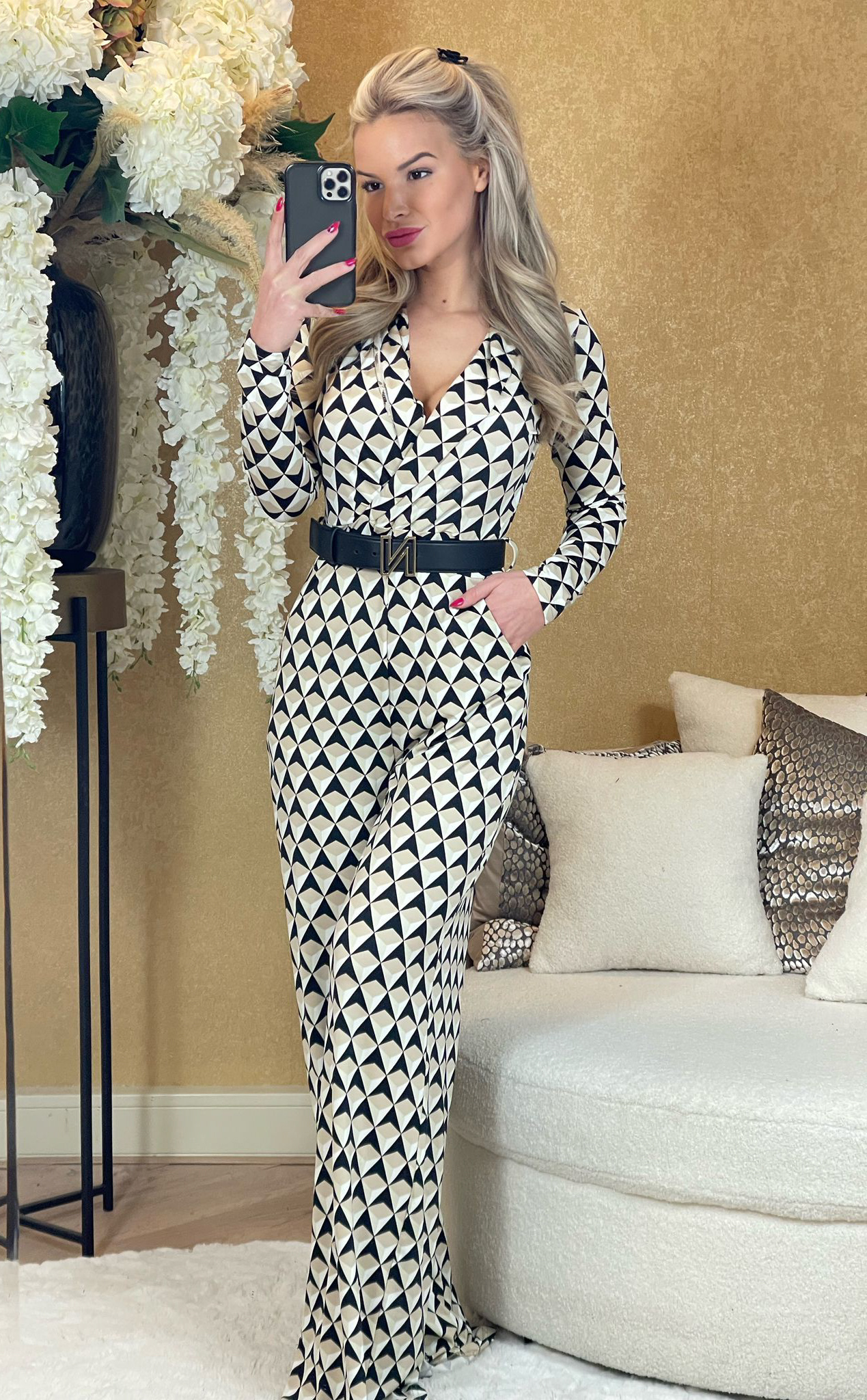TRAVEL LOVE! De Karina jumpsuit komt in een prachtige print. De jumpsuit heeft een bladerkraag, ceintuur in de taille en heeft zakken. Goed te dragen tot een lengte van 1,78 m