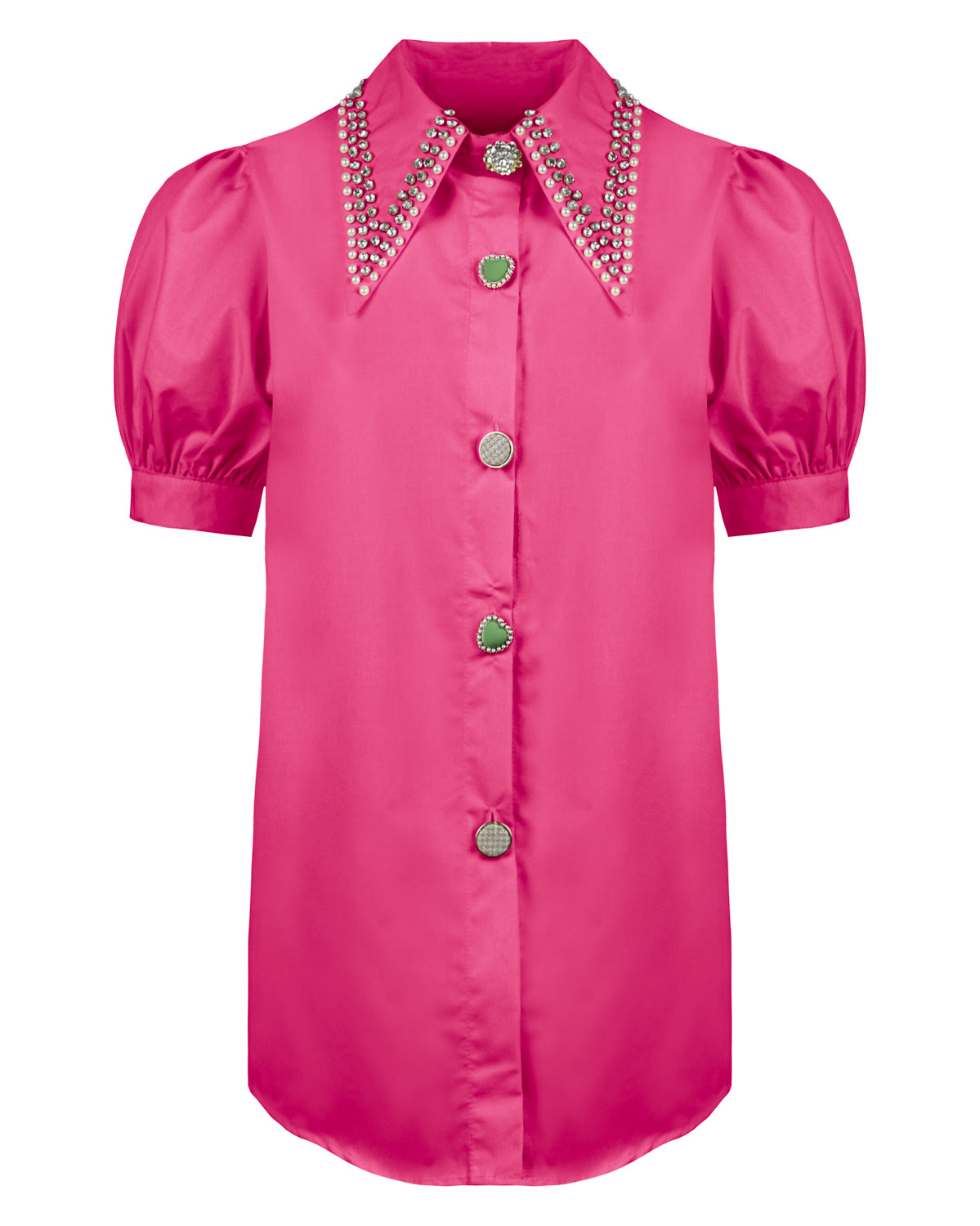 CHIC LOOK! Deze nieuwe blouse heeft prachtige parelmoer detail bij de kraag. De knoopjes aan de voorzijde zijn verschillend. Om de blouse af te maken heeft hij pofmouwtjes.... Lees meer