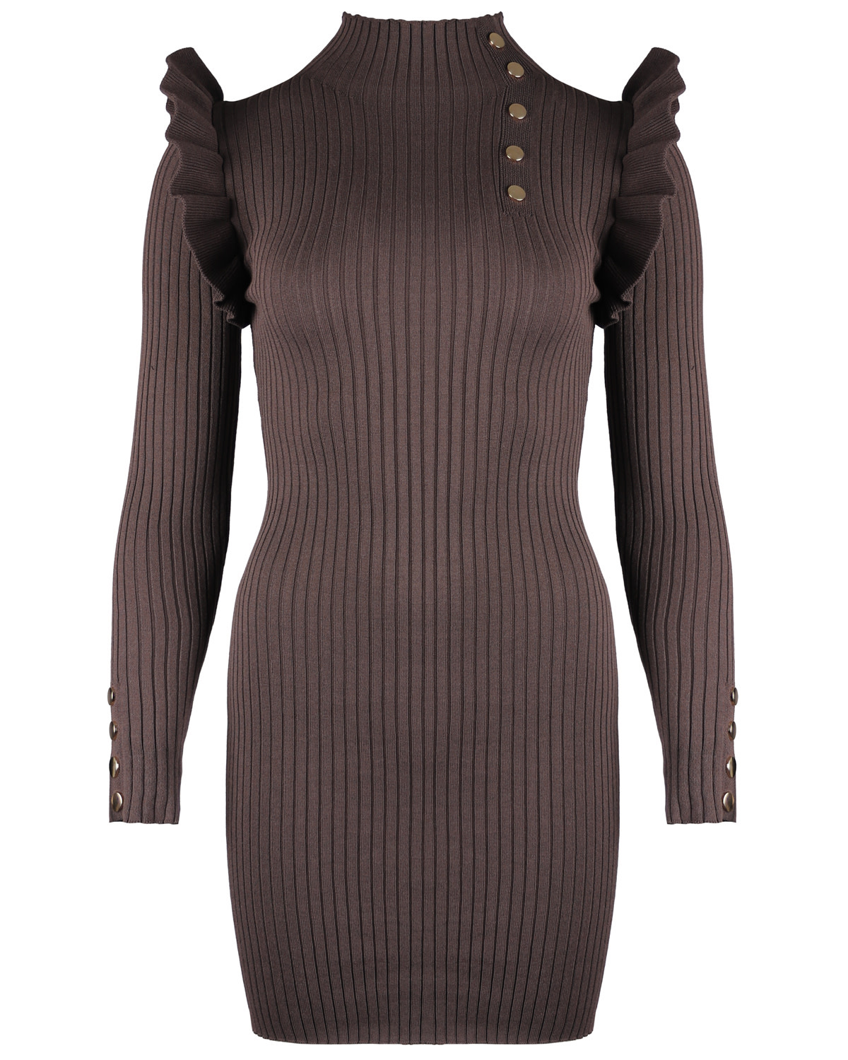 PERFECT BASIC! Deze Kenzie jurk kan je eindeloos dragen. Hij is gemaakt van een stretch rib stof, hij heeft een col, ruffles en gouden knopen. Een heerlijke basic voor je garderobe!