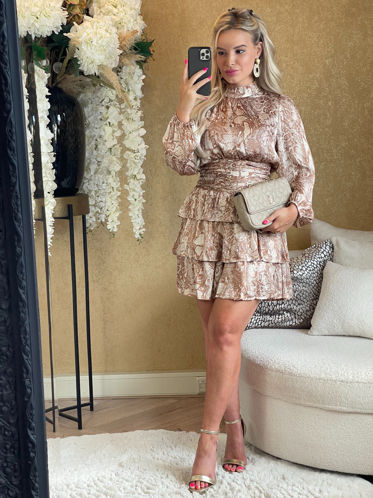 PRINT LOVE! De Mara jurk heeft een prachtige snake print. De jurk heeft een hoge hals en geplooide details in de taille wat zorgt voor een afslankend effect. Combineer de jurk met high heels of boots om de look af te maken.... Lees meer