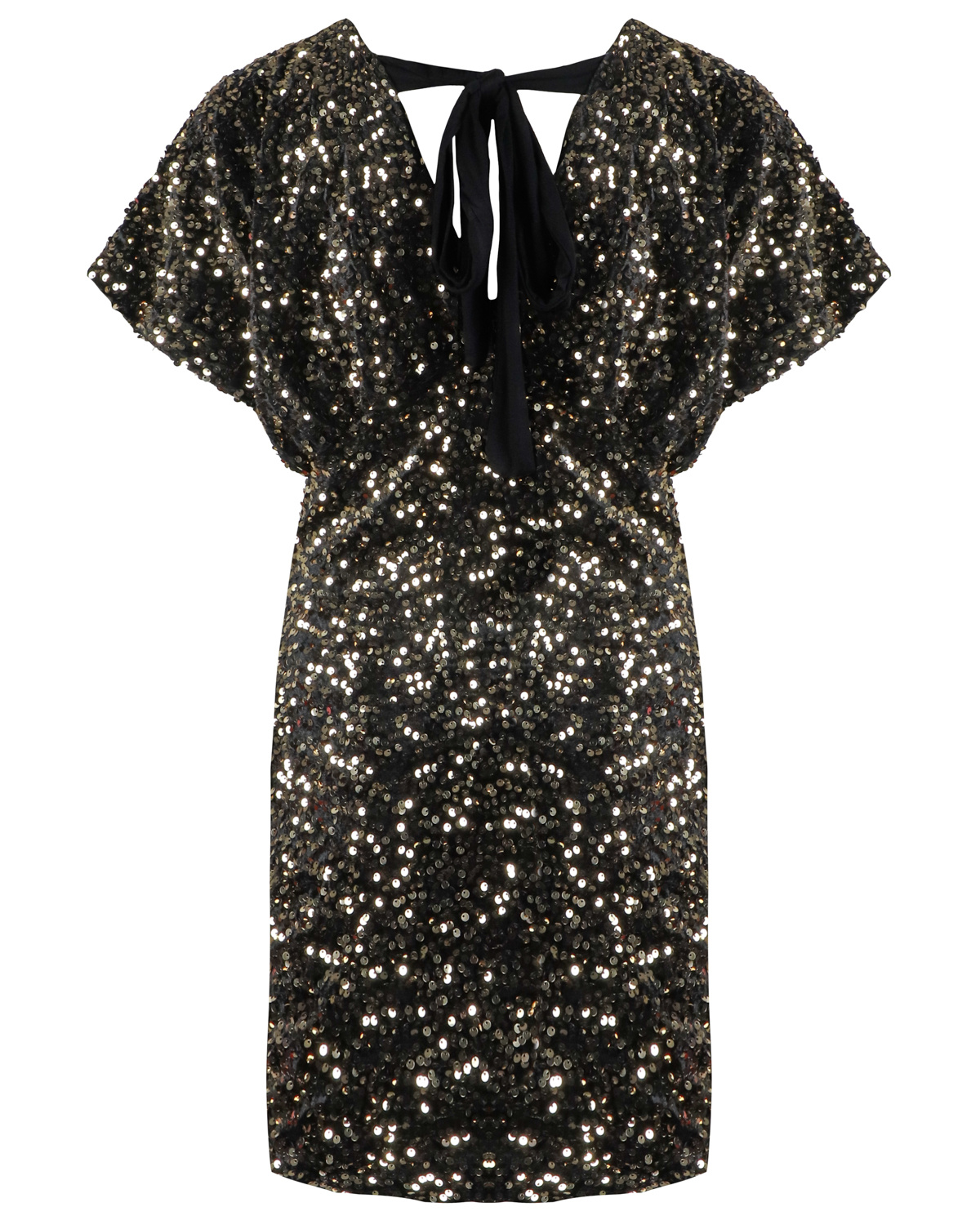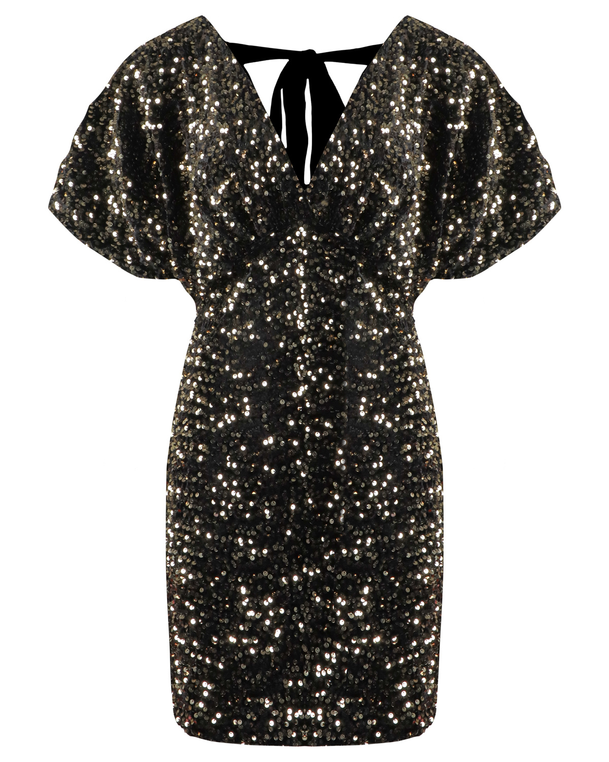 BOW DETAIL! Hoe cute is deze nieuwe Morgan jurk?! De jurk is van een stretch stof met allemaal pailletten, aan de achterkant zit een satijnen strik.