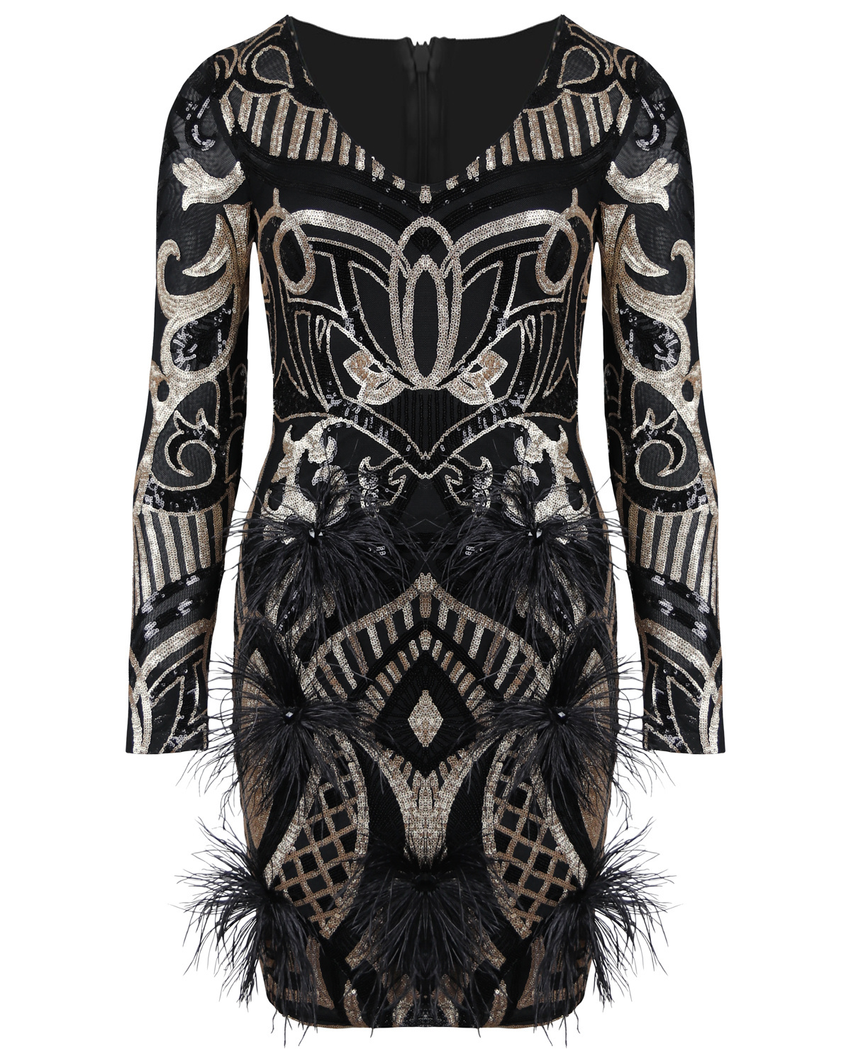 FEATHER DETAIL! We zijn helemaal fan van de Nyra jurk! De jurk is perfect voor een feestje. De sequin zijn in een patroon geplaatst, op de onderkant zitten veren details en bij de borst zit een klein mesh detail....... Lees meer