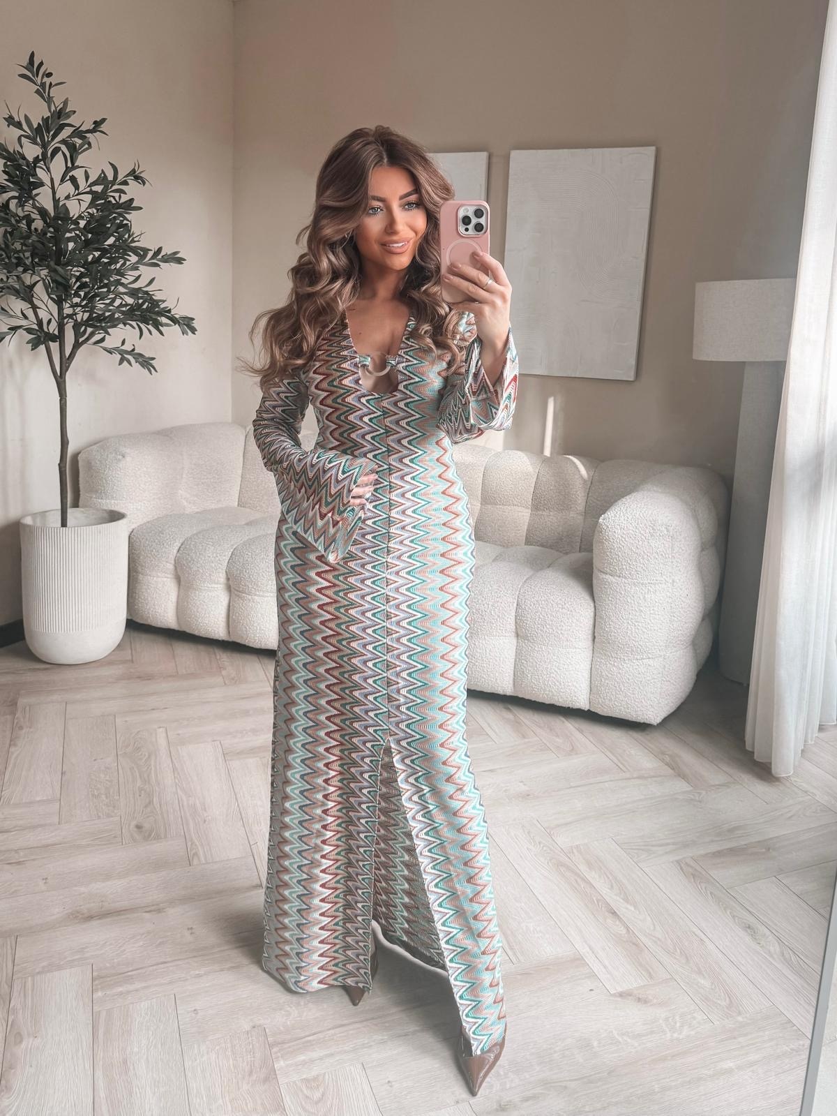 EYE CATCHER! Onze Ocean printed dress is DE musthave voor jouw garderobe! De jurk heeft een opvallend zigzagpatroon in warme tinten en een vrouwelijke, aangesloten pasvorm die je silhouet mooi accentueert.... Lees meer
