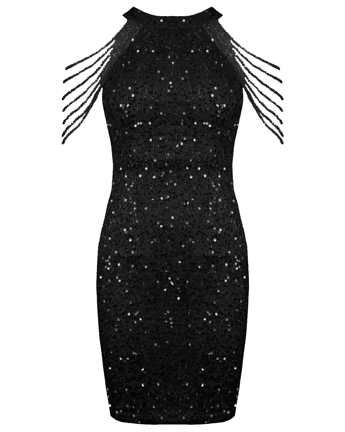 BEADED DETAIL! Hallo nieuwe party jurk! De Penelope sequin jurk heeft een halter nek met kralen kettinkjes op de schouders. Prachtig voor jouw volgende feestje.... Lees meer