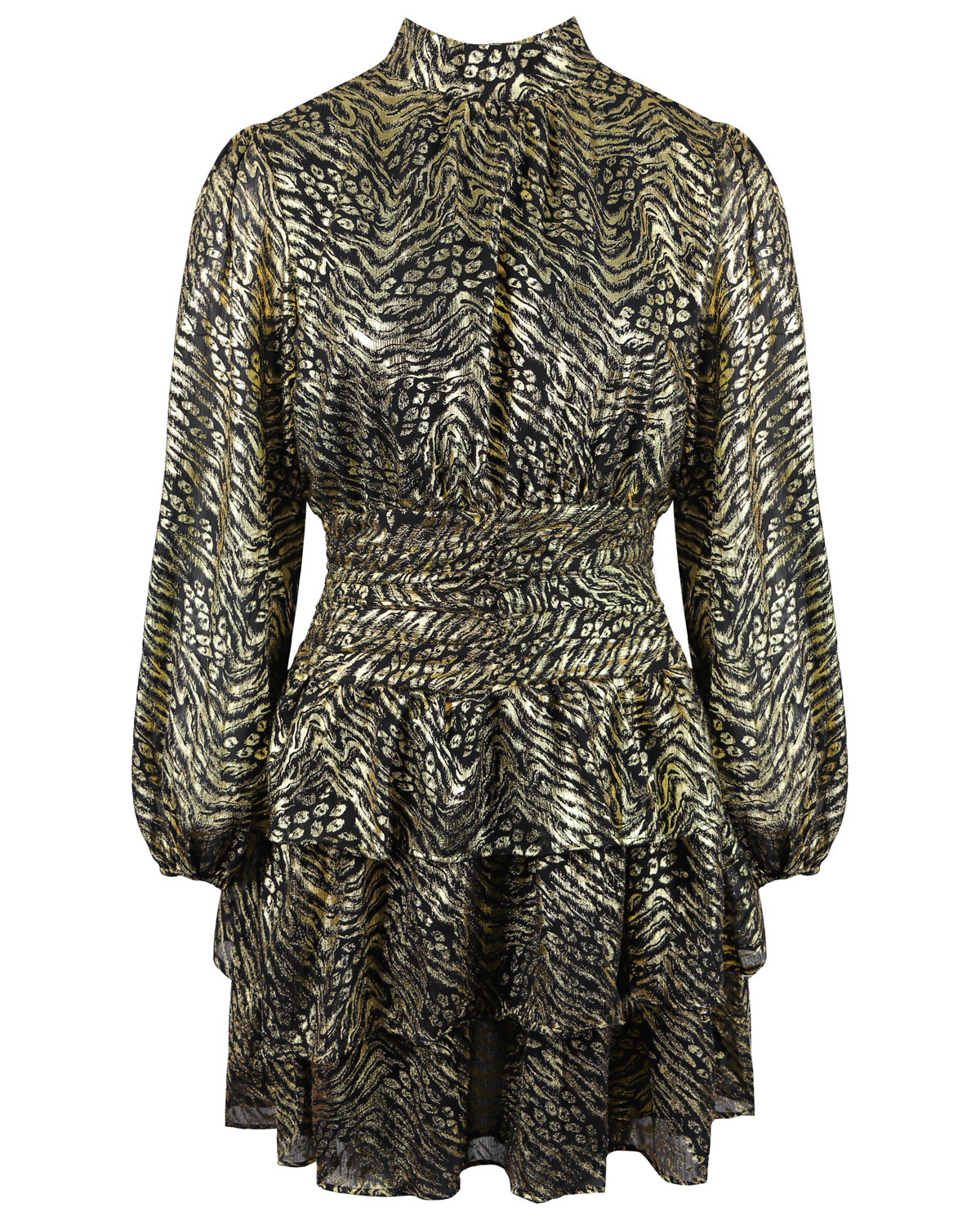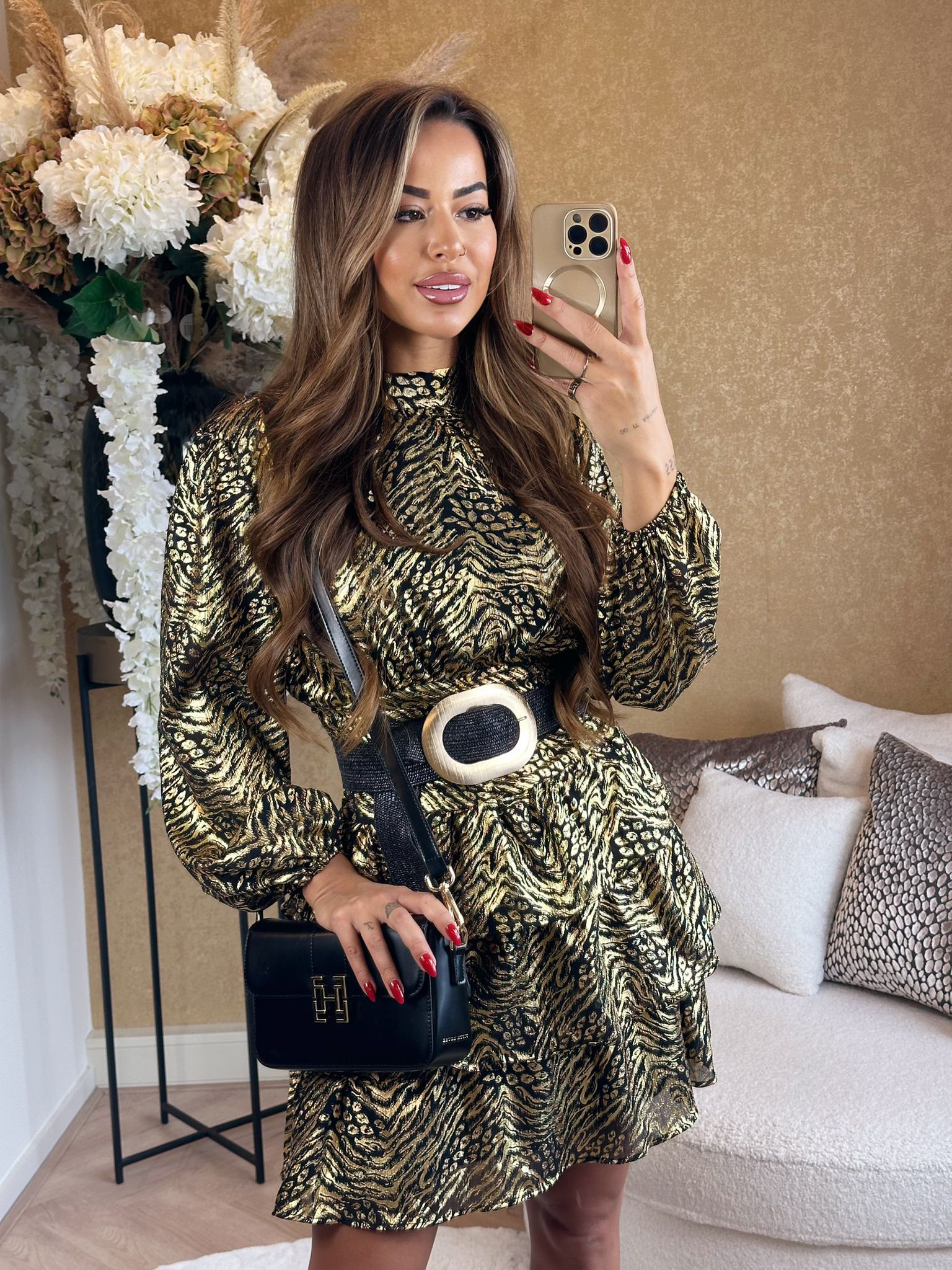 PRINT LOVE! De Phoebe jurk heeft een prachtige gouden print. De jurk heeft een hoge hals en geplooide details in de taille wat zorgt voor een afslankend effect. Combineer de jurk met high heels of boots om de look af te maken.... Lees meer