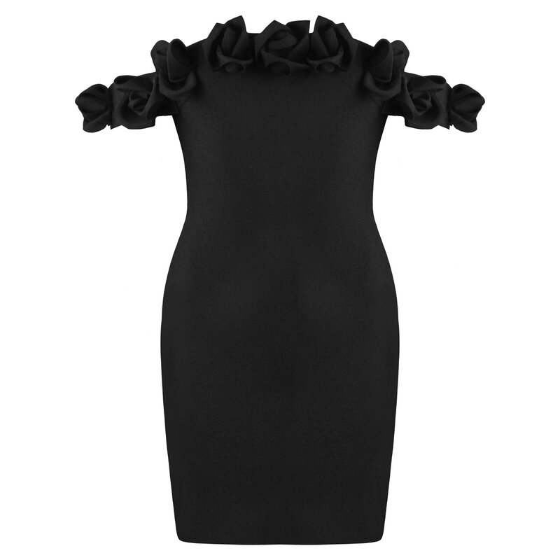 ELEGANT CHIC! Deze jurk is gemaakt van bandage stof waardoor hij prachtig naar het lichaam vormt. De jurk heeft een off shoulder fit met 3D roosjes. Draag hem met hakken voor een chique look.