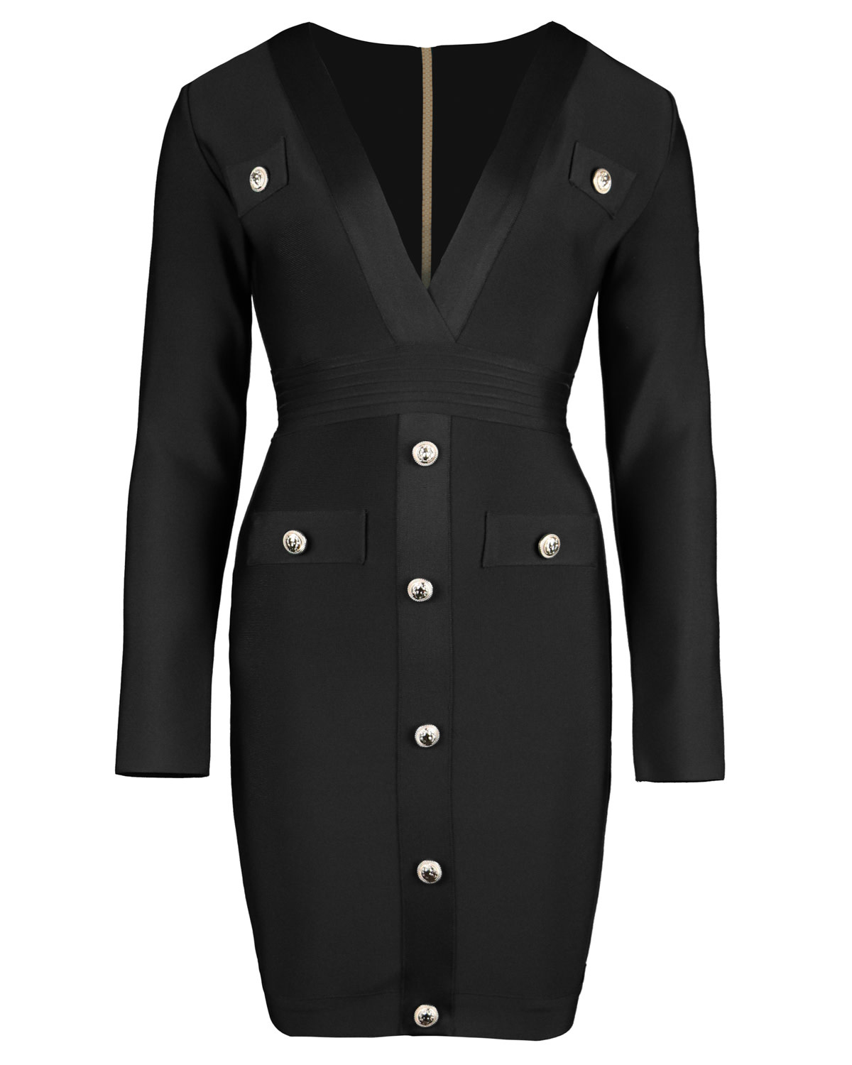 BANDAGE FABRIC! De Raelyn jurk heeft een prachtige v-hals. De jurk heeft meerdere gouden buttons op de jurk. Door de stevige bandage sluit deze jurk goed aan.... Lees meer
