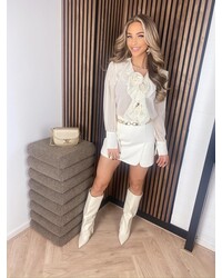 Elegante, semi-transparante blouse met verfijnde ruches en bloemdetails aan de voorzijde. De blouse heeft een vrouwelijke V-hals, lange mouwen met manchetten en een luchtige, soepelvallende stof.... Lees meer