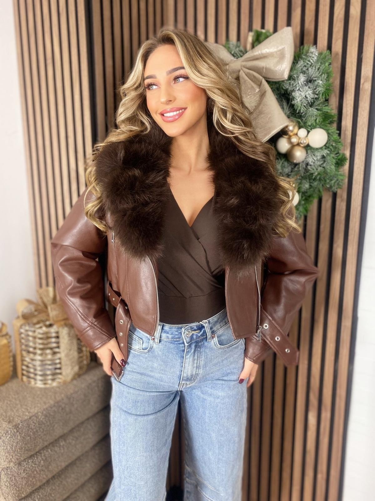 JAIMY Royal Furry Vegan Leather Jacket Choco