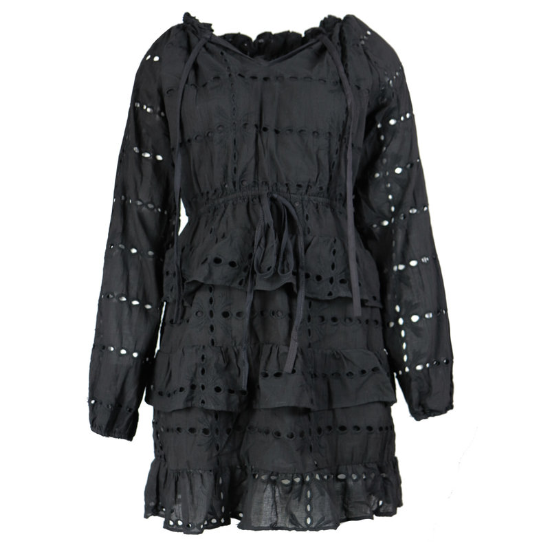 BIZA VIBES! Dit heerlijke jurkje heeft een lekker luchtig stofje. In de taille zit een koortje waardoor hij mooi strak getrokken kan worden. Het jurkje kan op of af de schouders gedragen worden.