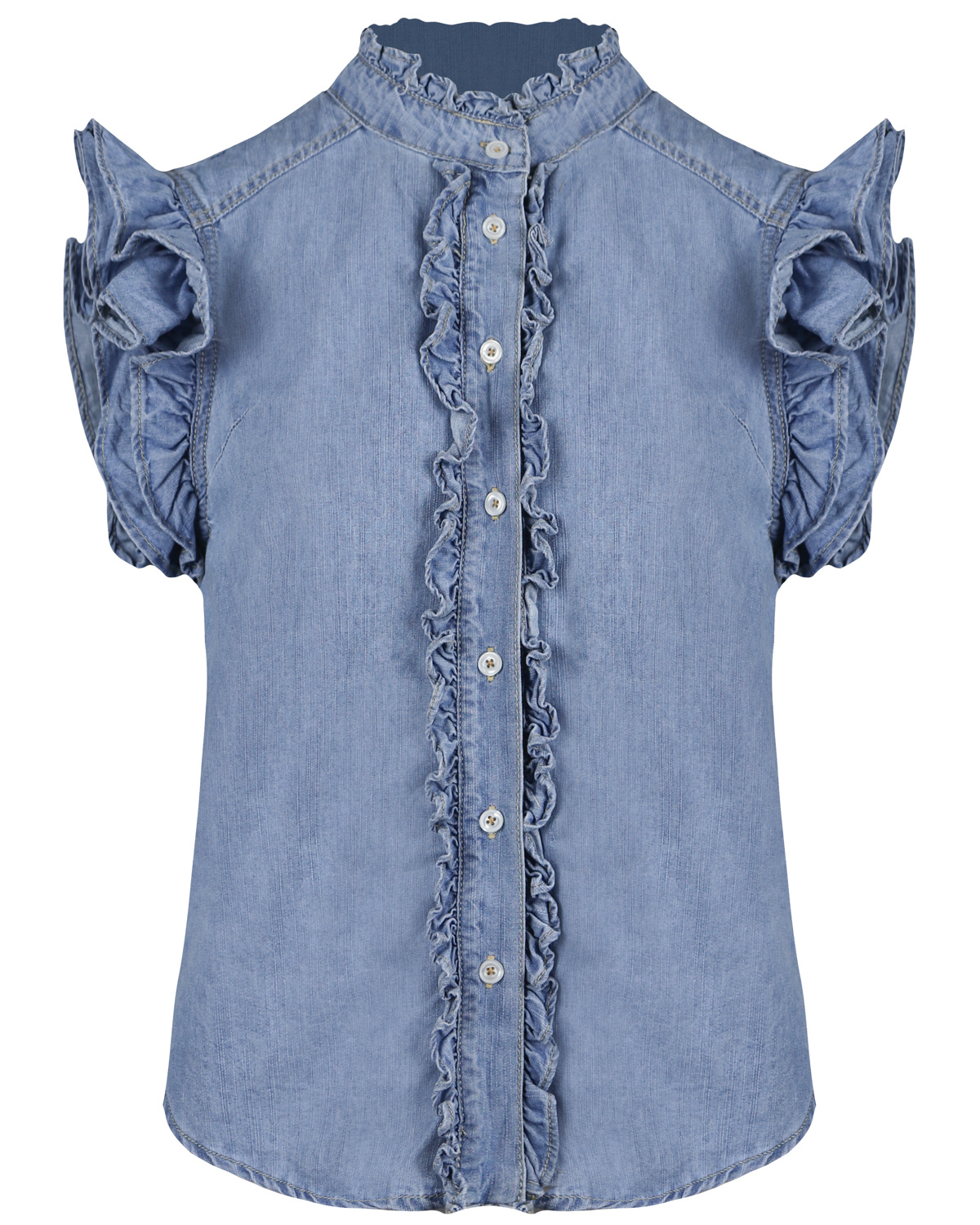 RUFFLE DETAIL! Dit nieuwe blouse is te leuk voor dit seizoen! Hij is gemaakt van een dunne denim stof waardoor hij lekker luchtig is. De blouse heeft meerdere ruffle details.... Lees meer