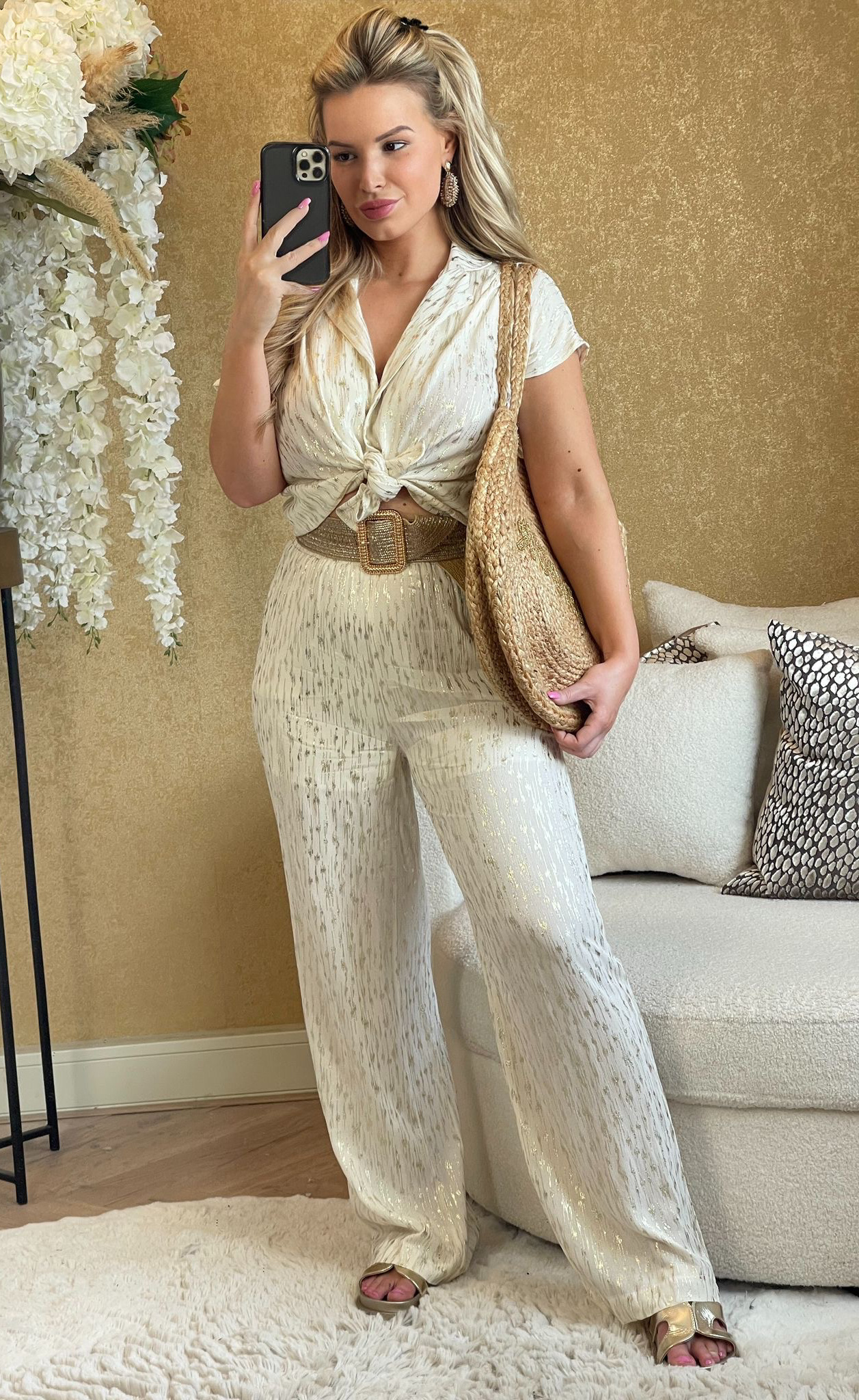 SUMMER MUSTHAVE! Hoe leuk is deze nieuwe blouse met gouden metallic print?! De blouse heeft een losse fit en korte mouwen. Combineer met de bijpassende broek voor een complete set.