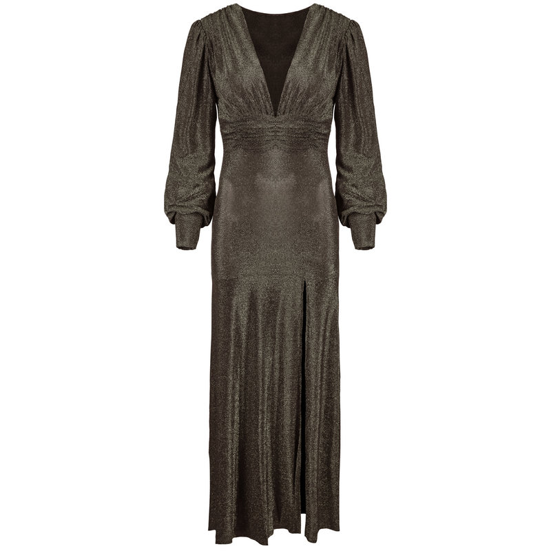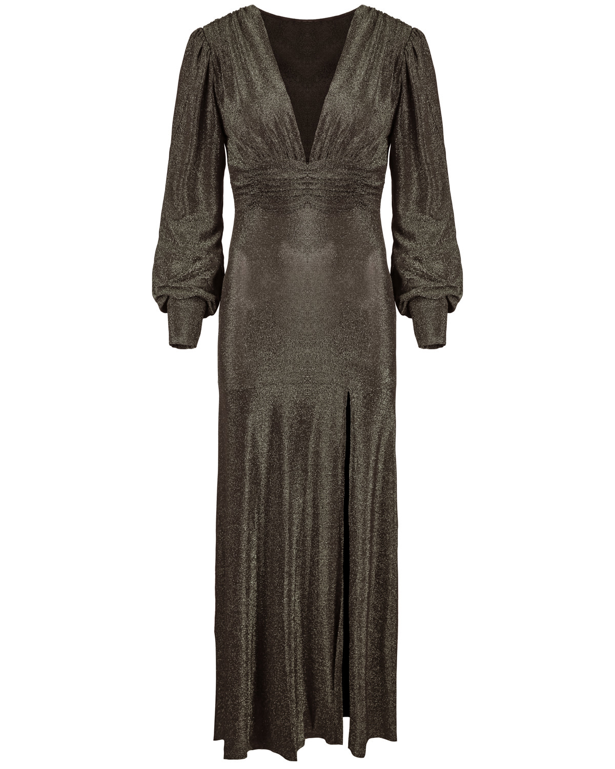 ELEGANT CHIC! De Shay jurk heeft een prachtige maxi lengte met een split op het linkerbeen. Om de jurk een sexy touch te geven heeft hij een diepe v-hals. De stof heeft een prachtige glitter.... Lees meer