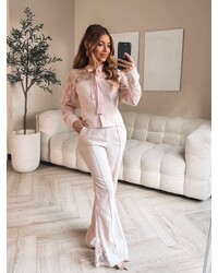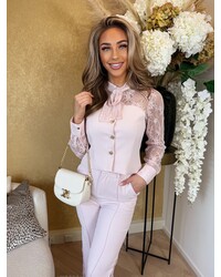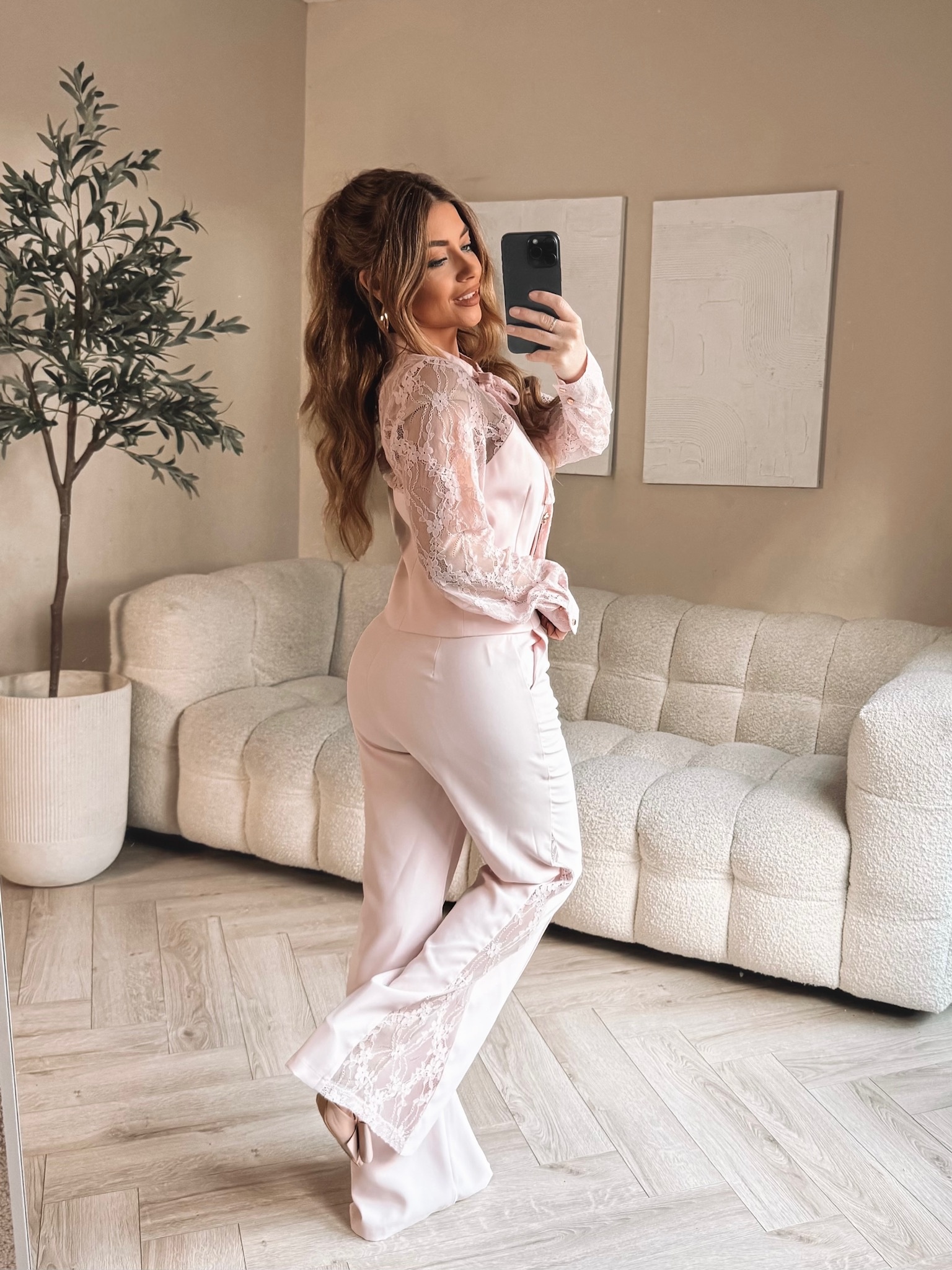 Elegante Lace Blazer in Trendkleur Soft Blush – met verfijnde strik en romantische kanten details.... Lees meer