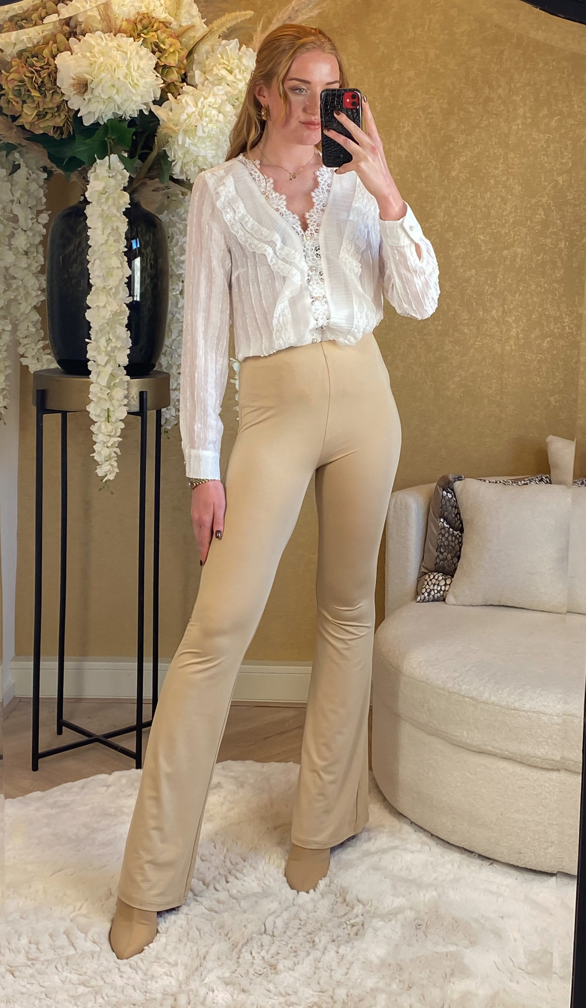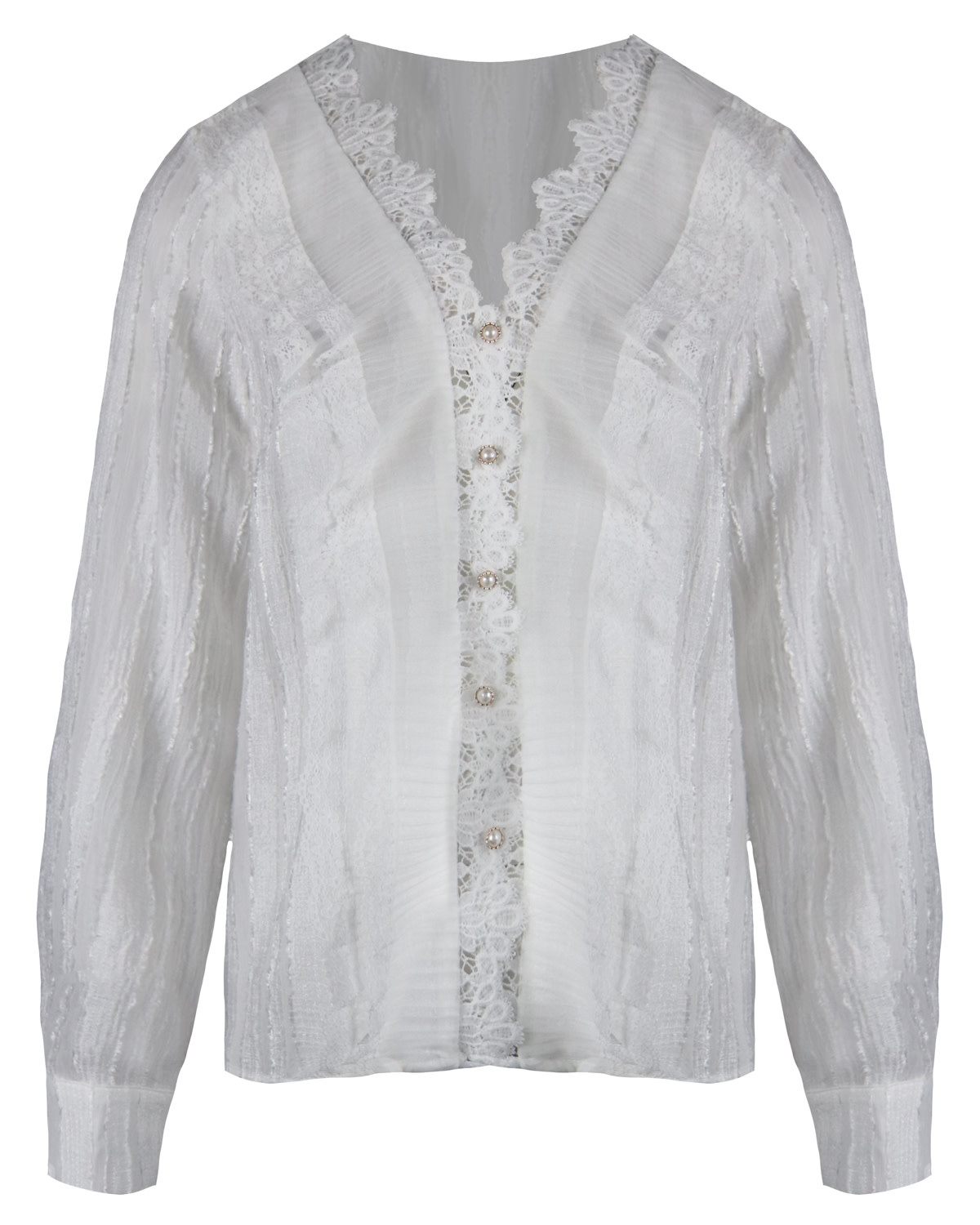 RUFFLE LOVE! Hoe leuk is deze blouse met Ruffels en crochet details?! In de blouse zit een subtiel lurex draadje en de knopen hebben een parelmoer look.... Lees meer