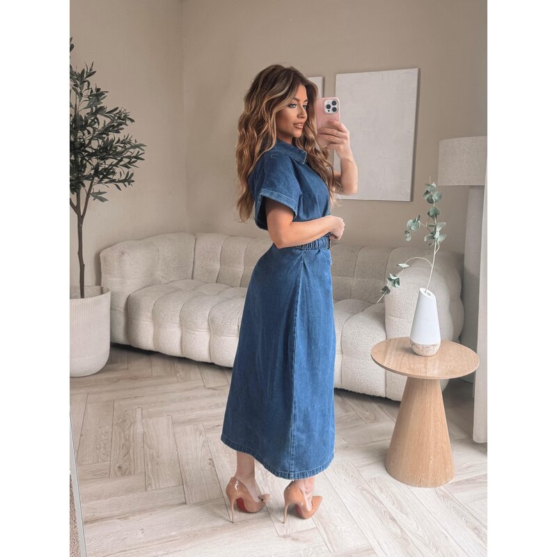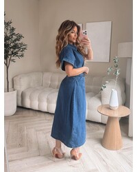 Lange denim jurk met stijlvolle knoopsluiting en klassieke kraag. Inclusief bijpassende riem om de taille mooi te accentueren. Valt elegant en is perfect voor zowel casual als chique. Makkelijk te combineren met sneakers of hakken!... Lees meer