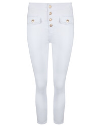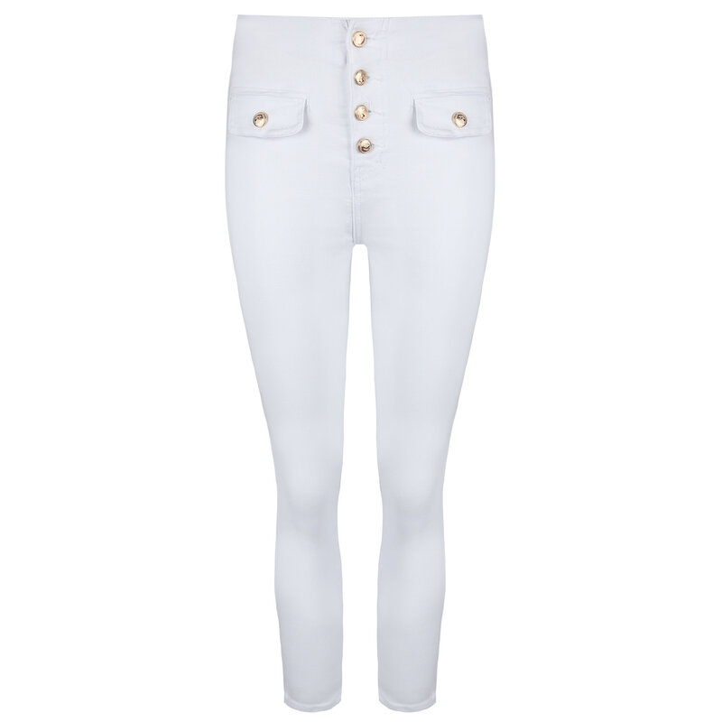 GOLD BUTTONS! Hoe mooi is deze jeans met gouden knopen detail bij de sluiting en op de heup. De jeans heeft een hoge taille en is van stretch stof gemaakt.... Lees meer