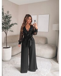 SEQUIN LOVE! Deze sequin jumpsuit is prachtig! De jumpsuit heeft een mooi v hals gecombineerd met transparante mouwen. Door de voorgevormde cups kan hij zonder bh gedragen worden. De strik kan zowel voor als achter gedragen worden.... Lees meer