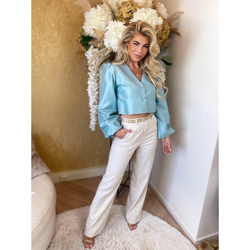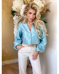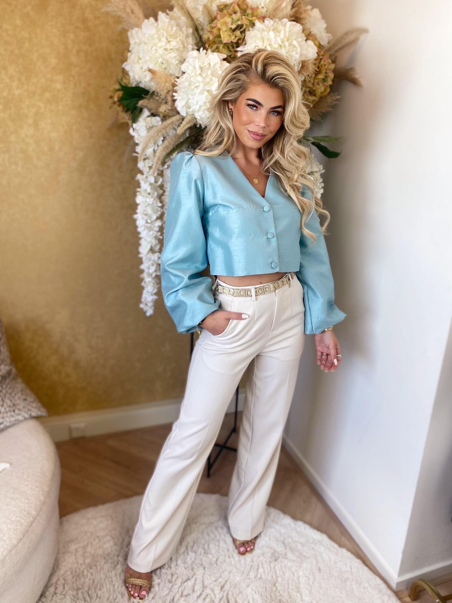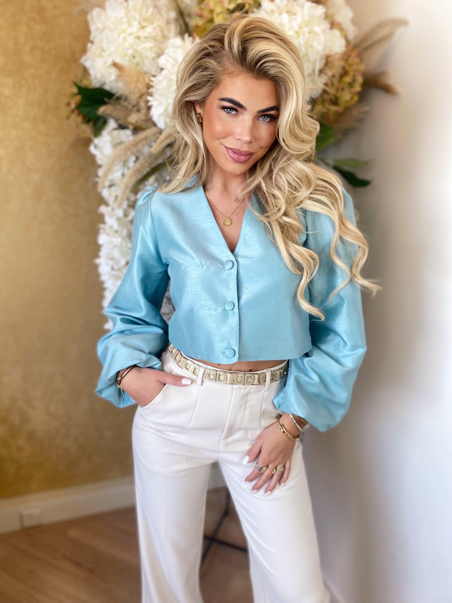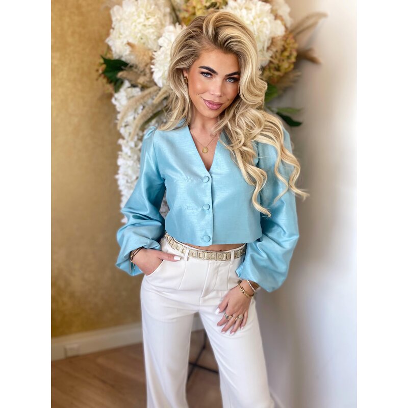 Deze elegante cropped blazer in een glanzende lichtblauwe stof heeft stijlvolle pofmouwen wat zorgt voor een vrouwelijke, modieuze uitstraling. Het cropped model combineert perfect met zowel hoge taille broeken als rokken voor een chique look.... Lees meer