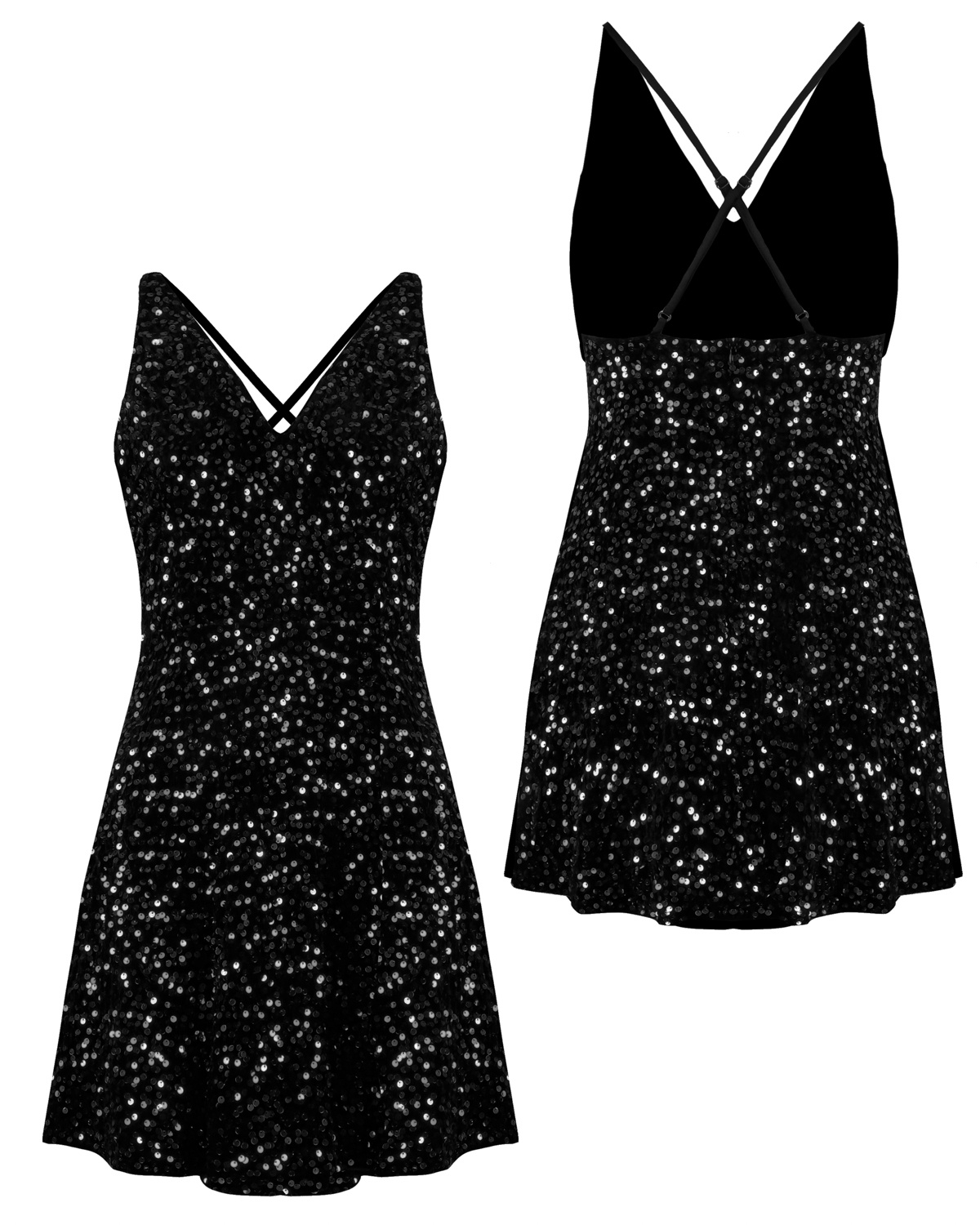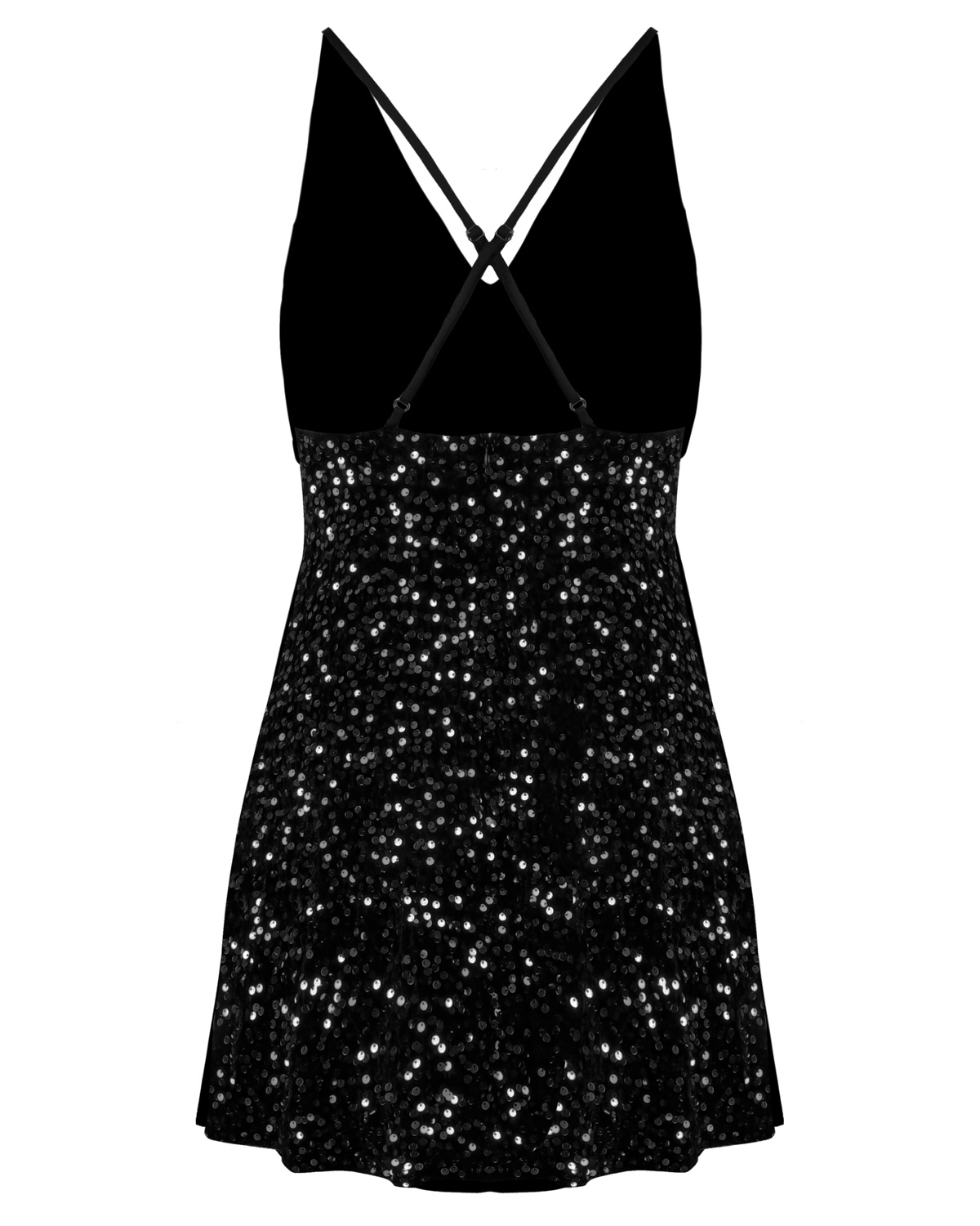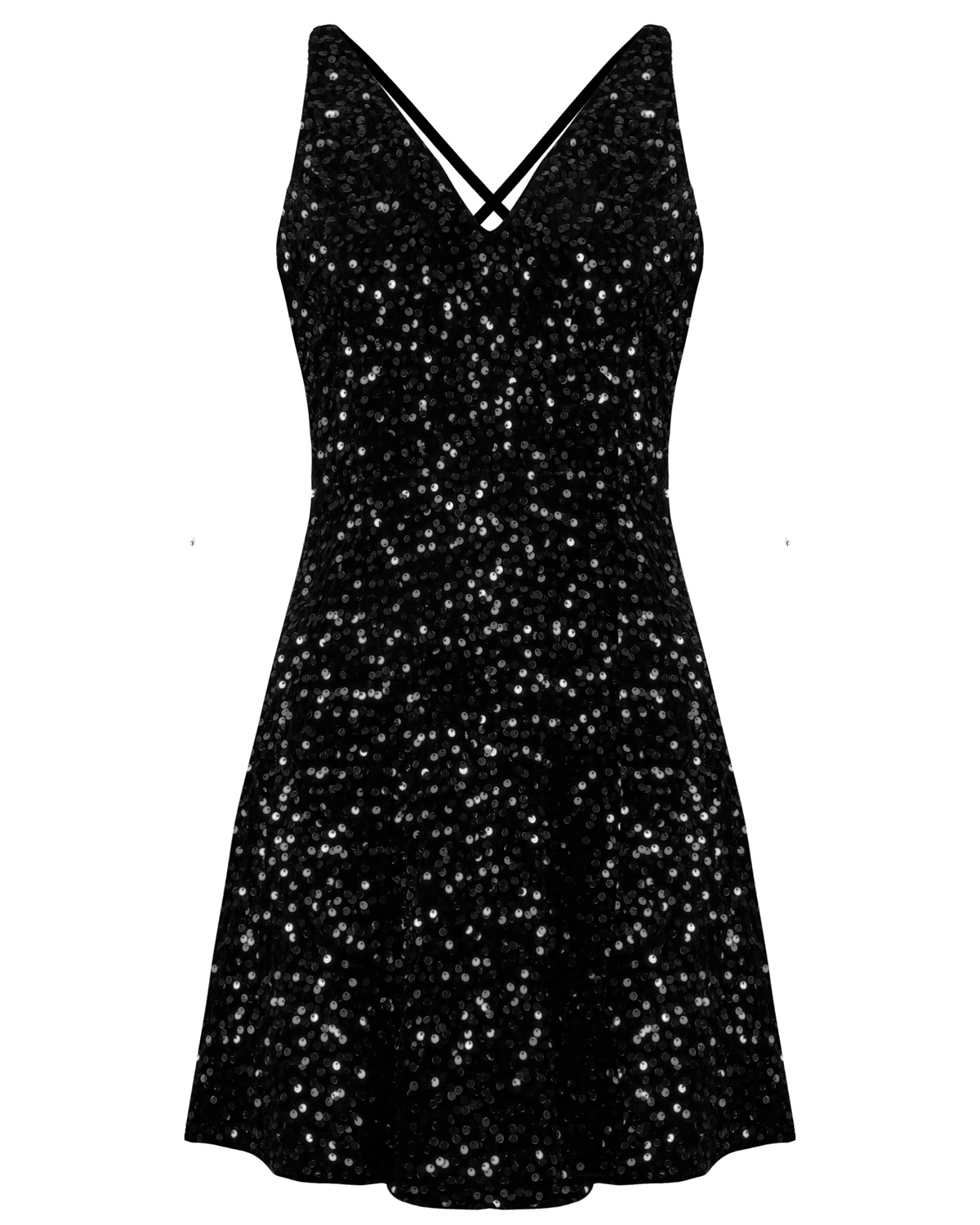 SEQUIN LOVER! Deze Zendaya jurk is een echte party musthave! De jurk is helemaal versierd met pailletten en heeft een v-hals met een open rug. Maak je outfit af met hoge hakken.